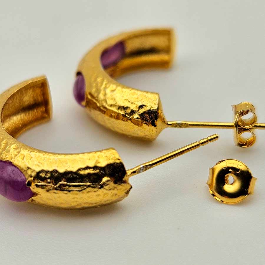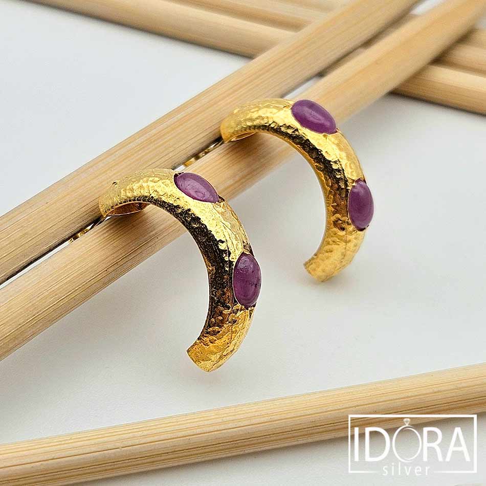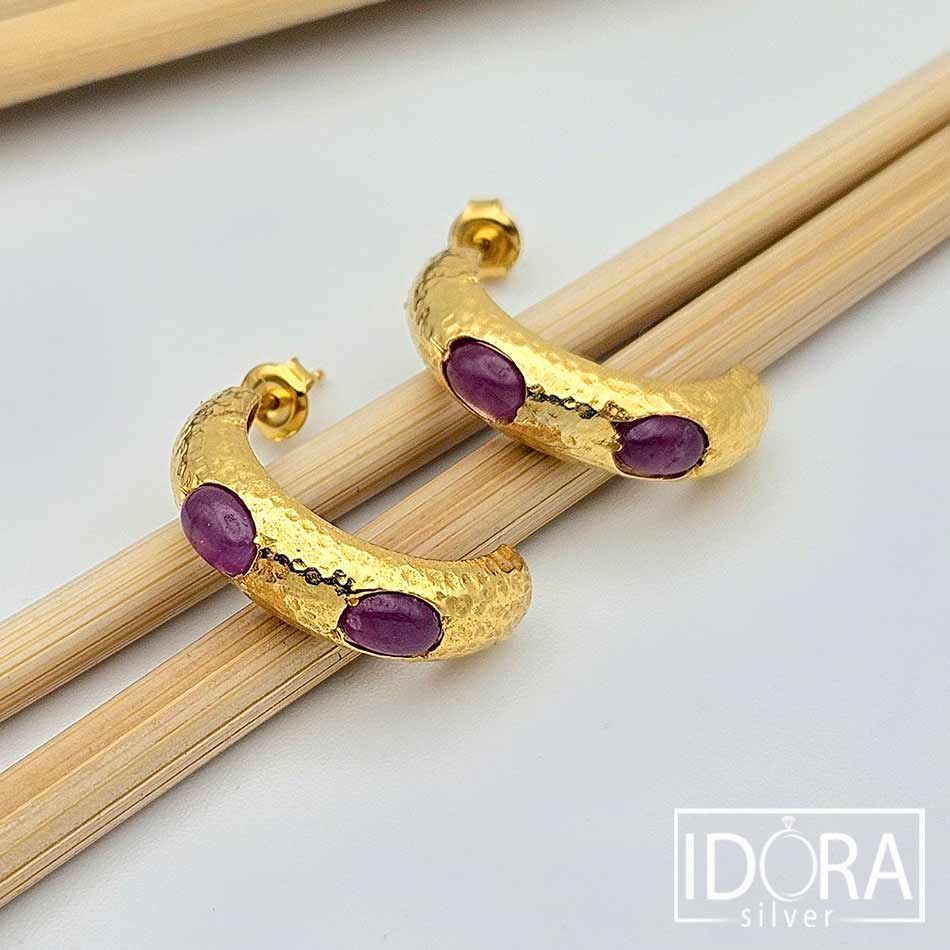 РУБИНИ вковани в лицевата част на полу-халки с ефект на ковано сребро в позлата, силно подчертаваща цвета на камъните.