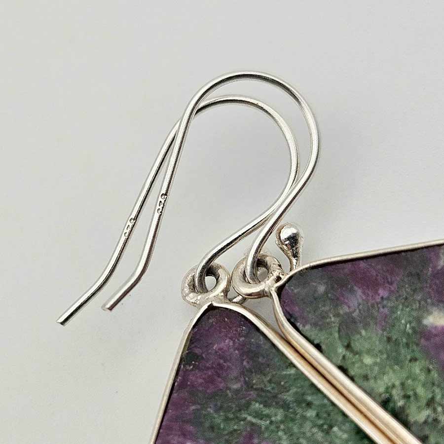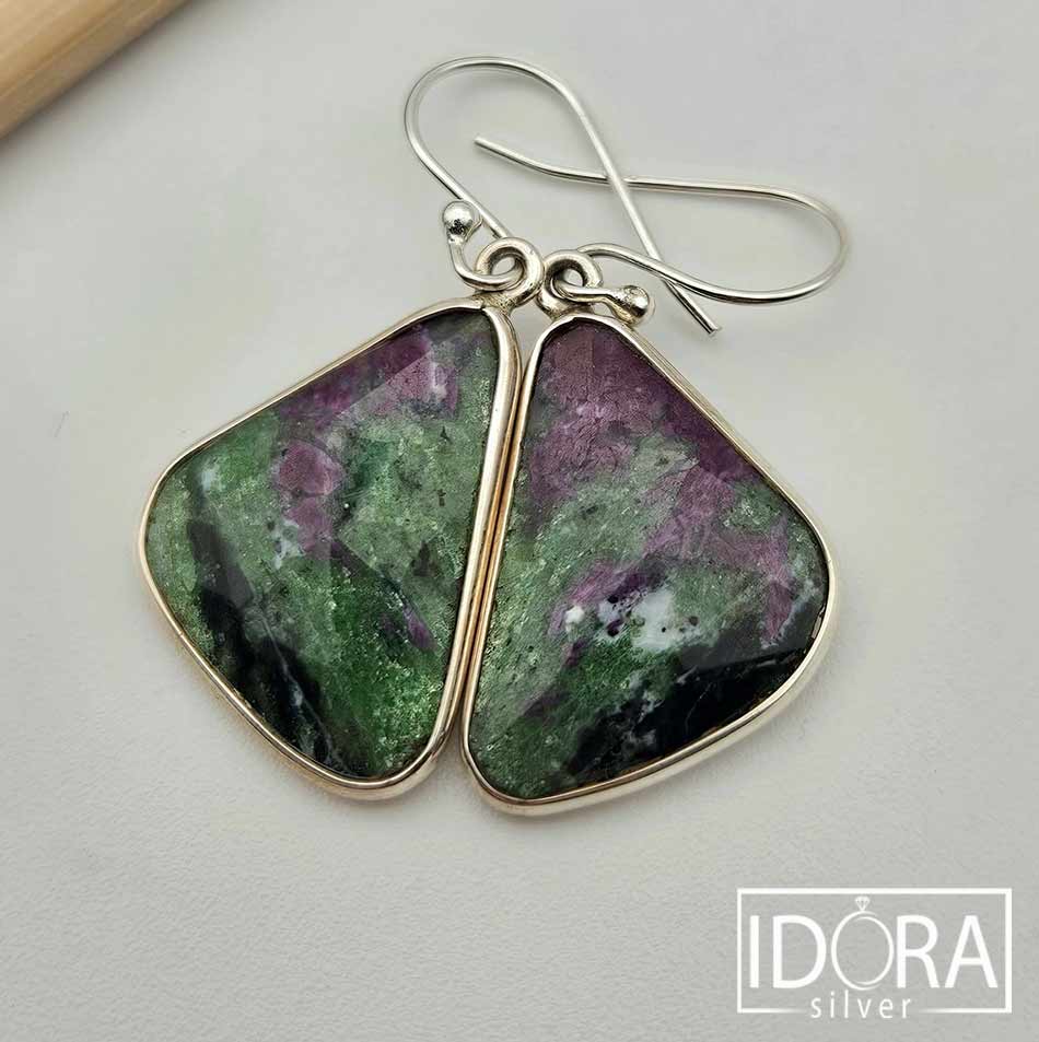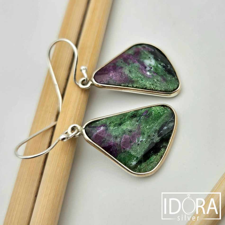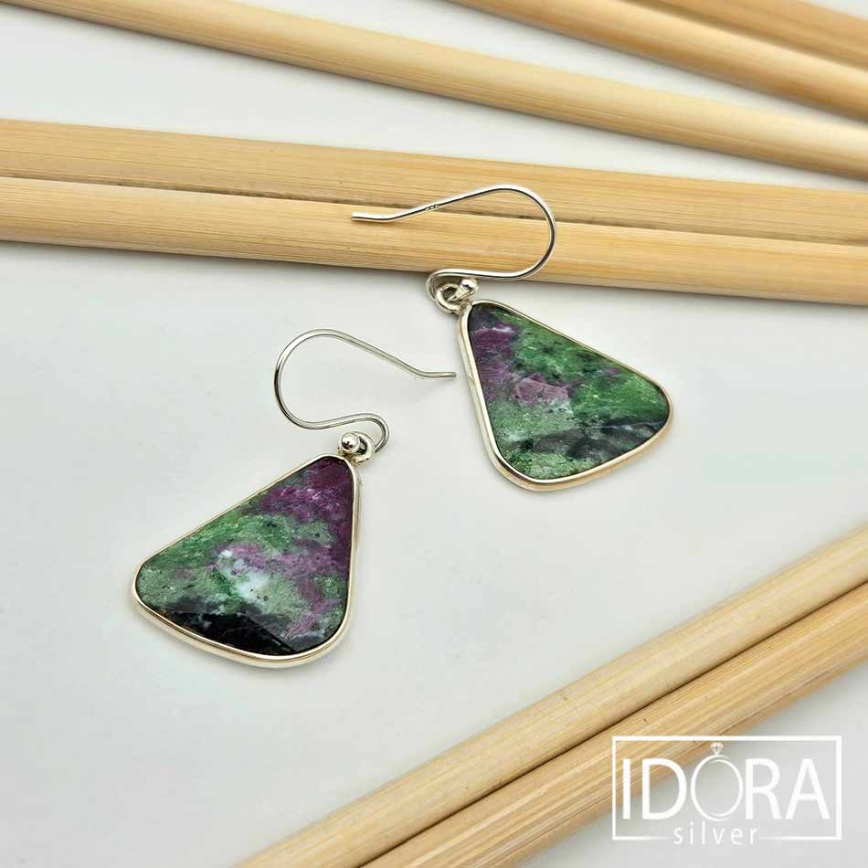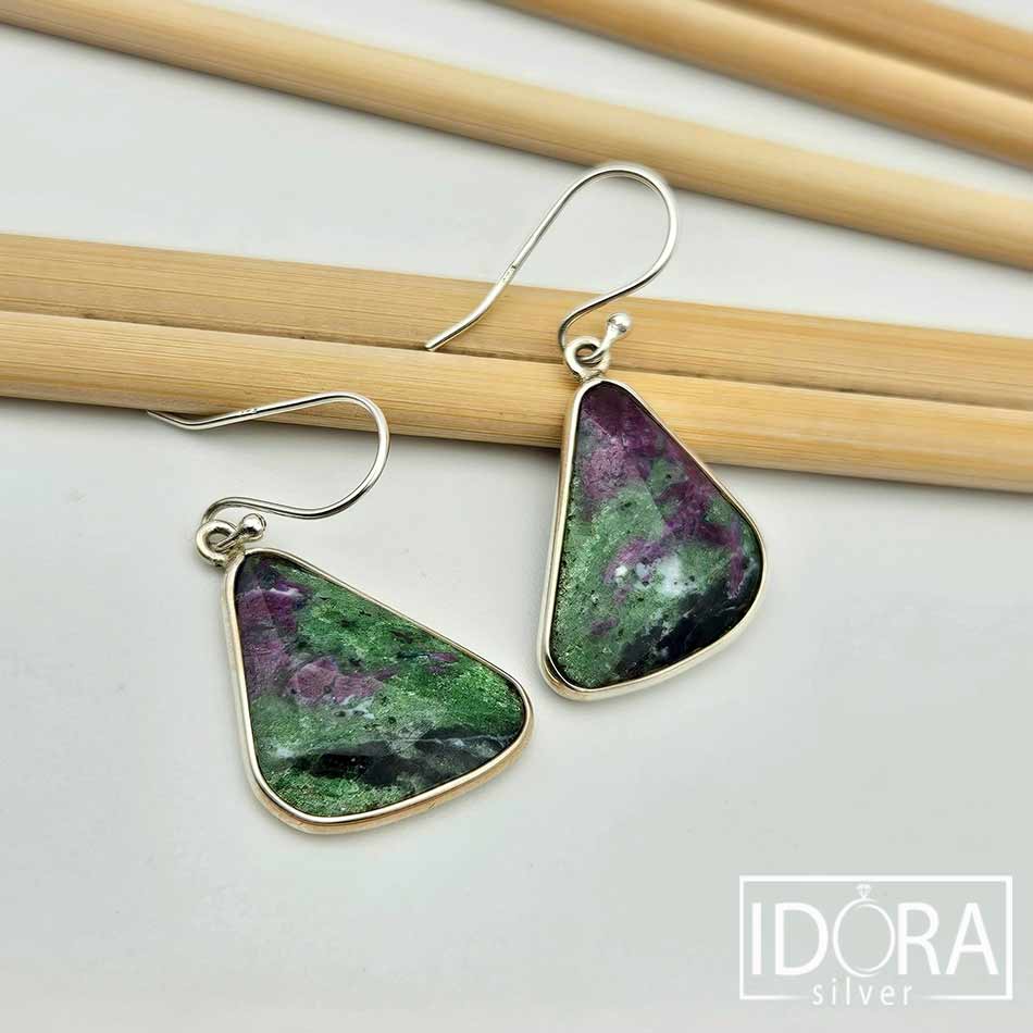 Обеци от стествен РУБИН В ЦОИЗИТ (аниолит), с неповторими преливащи нюанси, семпло обрамчен в сребро – всяка плочка е оформено в органична, триъгълна форма, която подчертава естествената структура на минерала, деликатно подчертана от сребърната рамка, добавяща изискан завършек, без да отвлича вниманието от живописната текстура на камъка.
