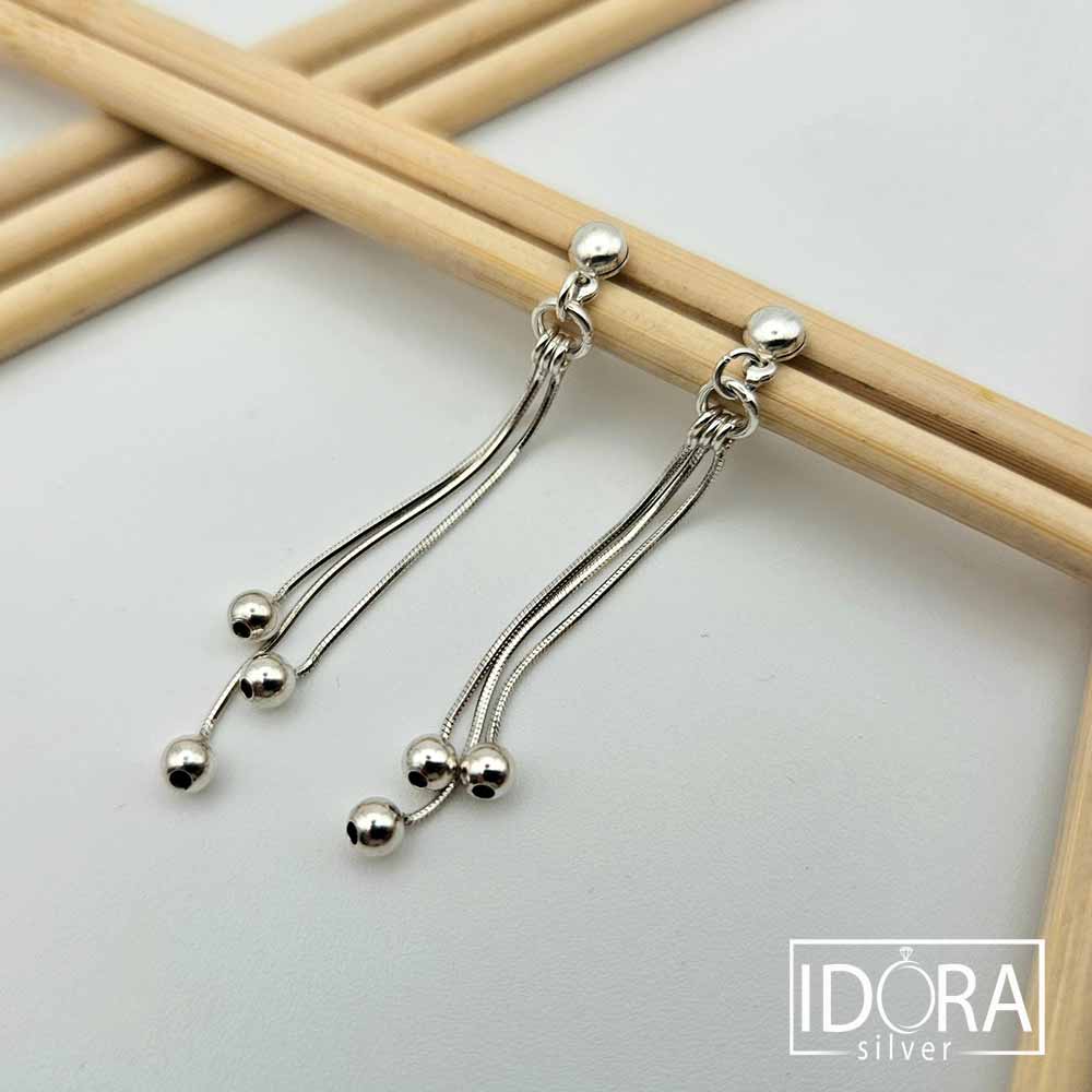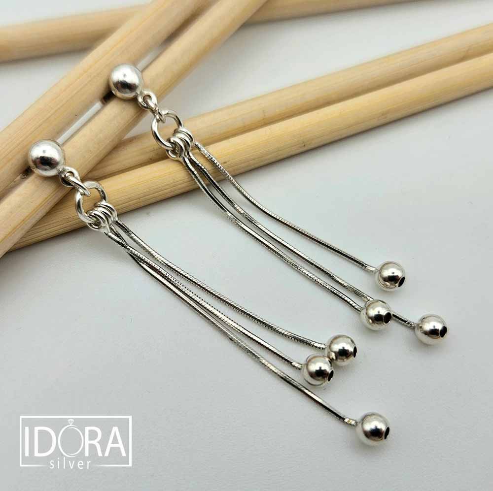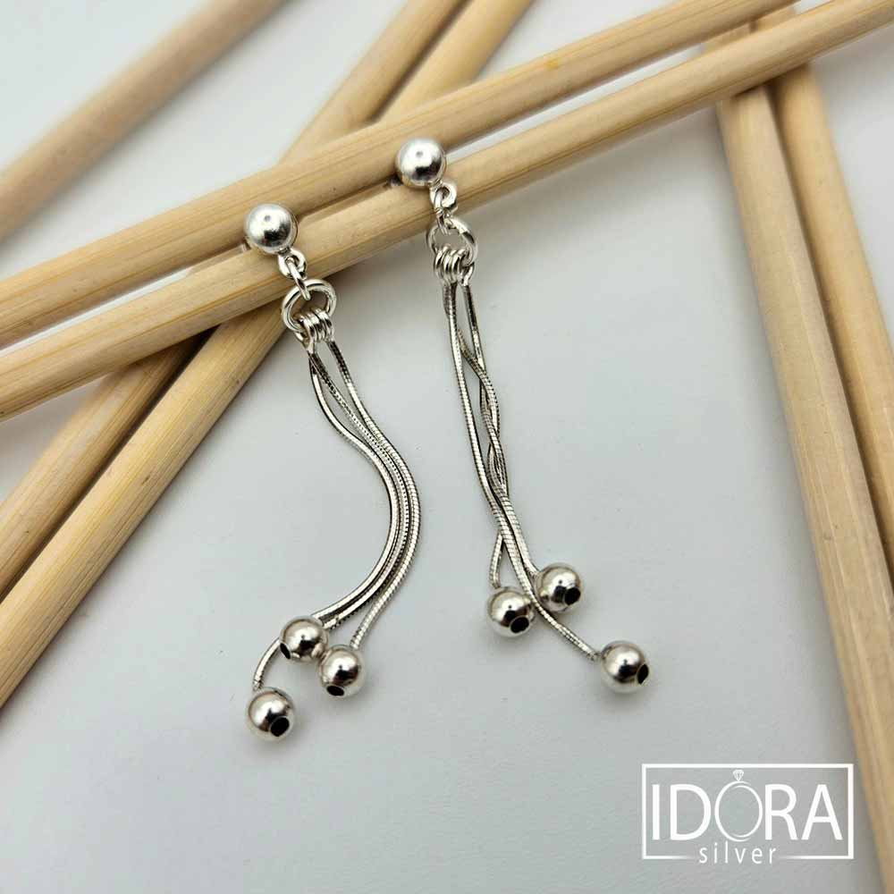 Обеци с трио нишки и висящи с елегантна лекота топчета, носещи усещане за движение и фин ритъм при всяко движение. Държач от гладка, блестяща топка, която придава минималистично начало на игривата чаровна композиция.