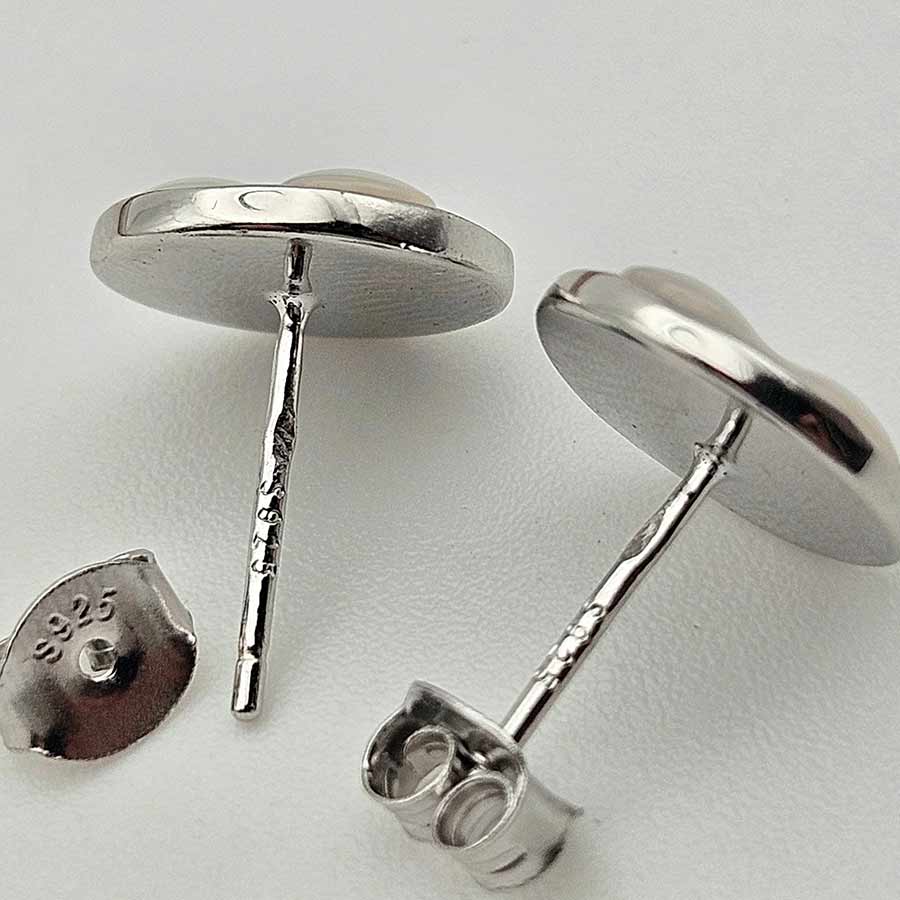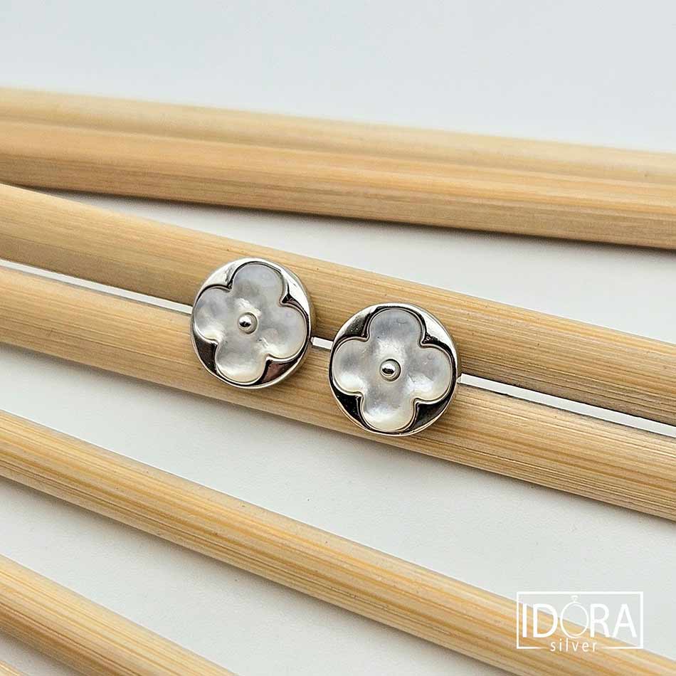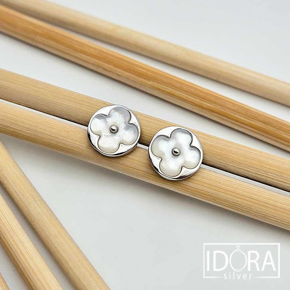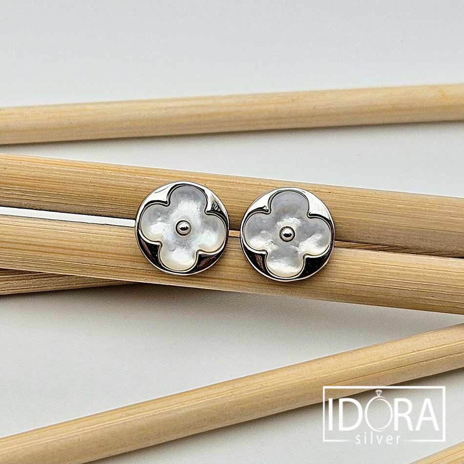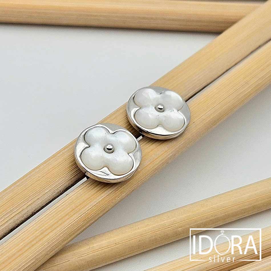 БЯЛ СЕДЕФ разцъфтял в миниатюрни цветове, уловени в миг на съвършено спокойствие – гладката перлена повърхност сияе нежно подчертана от сребърен родиран контур, в роля на фина рамка на изящно нарисувана картина. Обеци носещи деликатност, собствена сила и присъствие.
