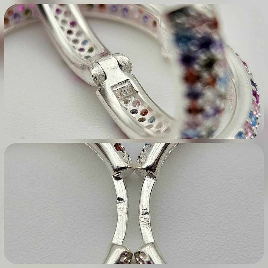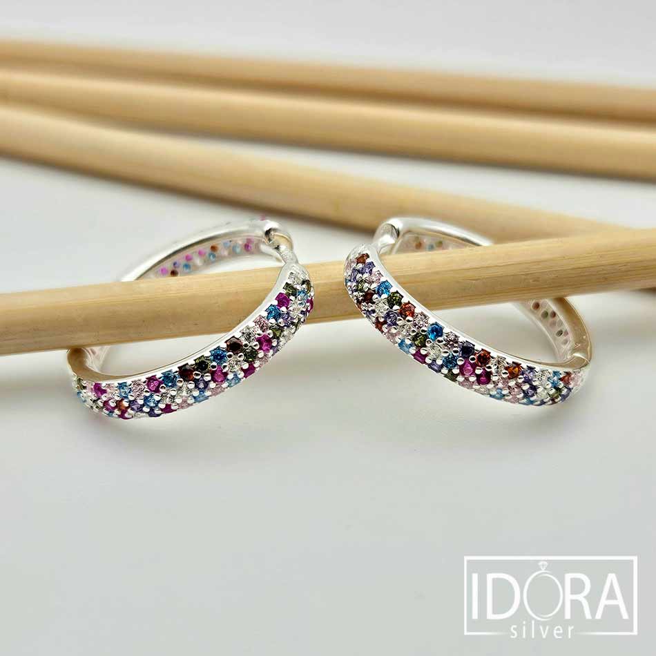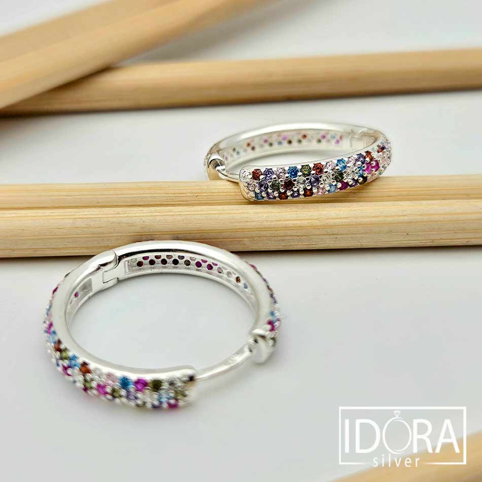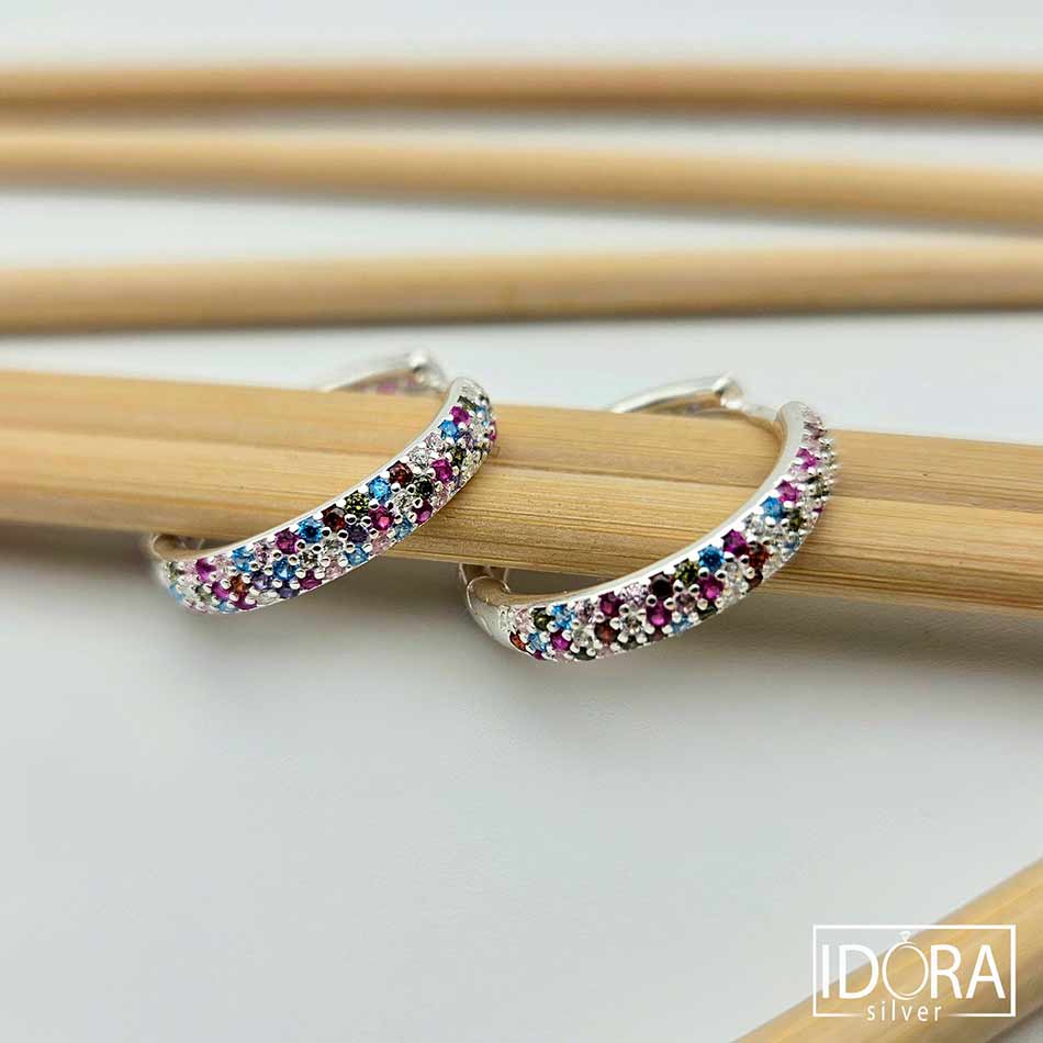 Изящни халки, носещи усещане за елегантност, светлина и движение – фина дъга от сребро обсипана с многоцветни циркониеви камъчета, блестящи като искри в мозайка и подредени в хармоничен ритъм. Смелата игра на цветовете и изчистената линия излъчват съвременна женственост, настроение и неприкрита свобода.
