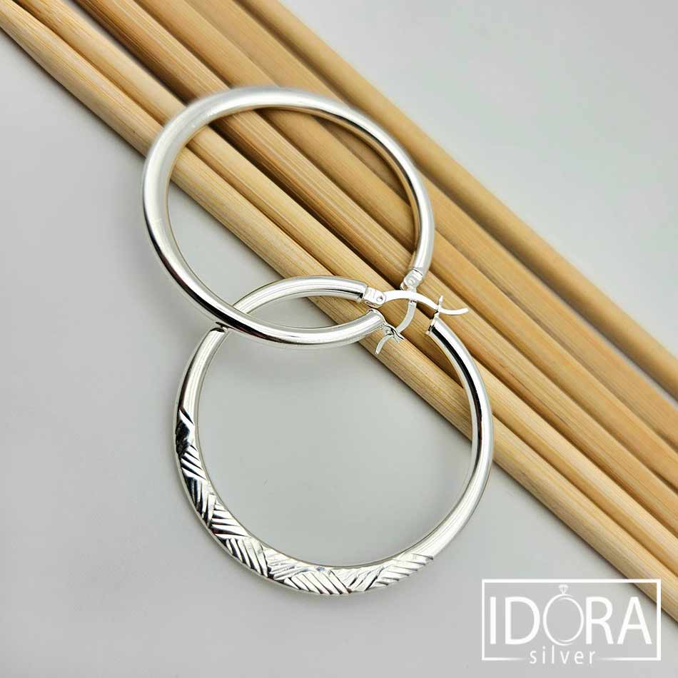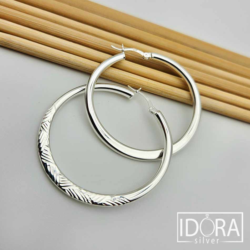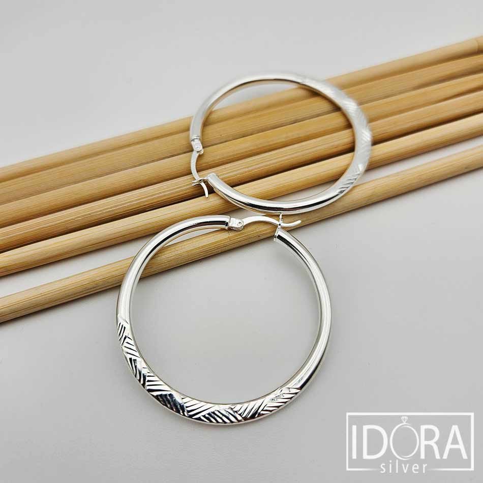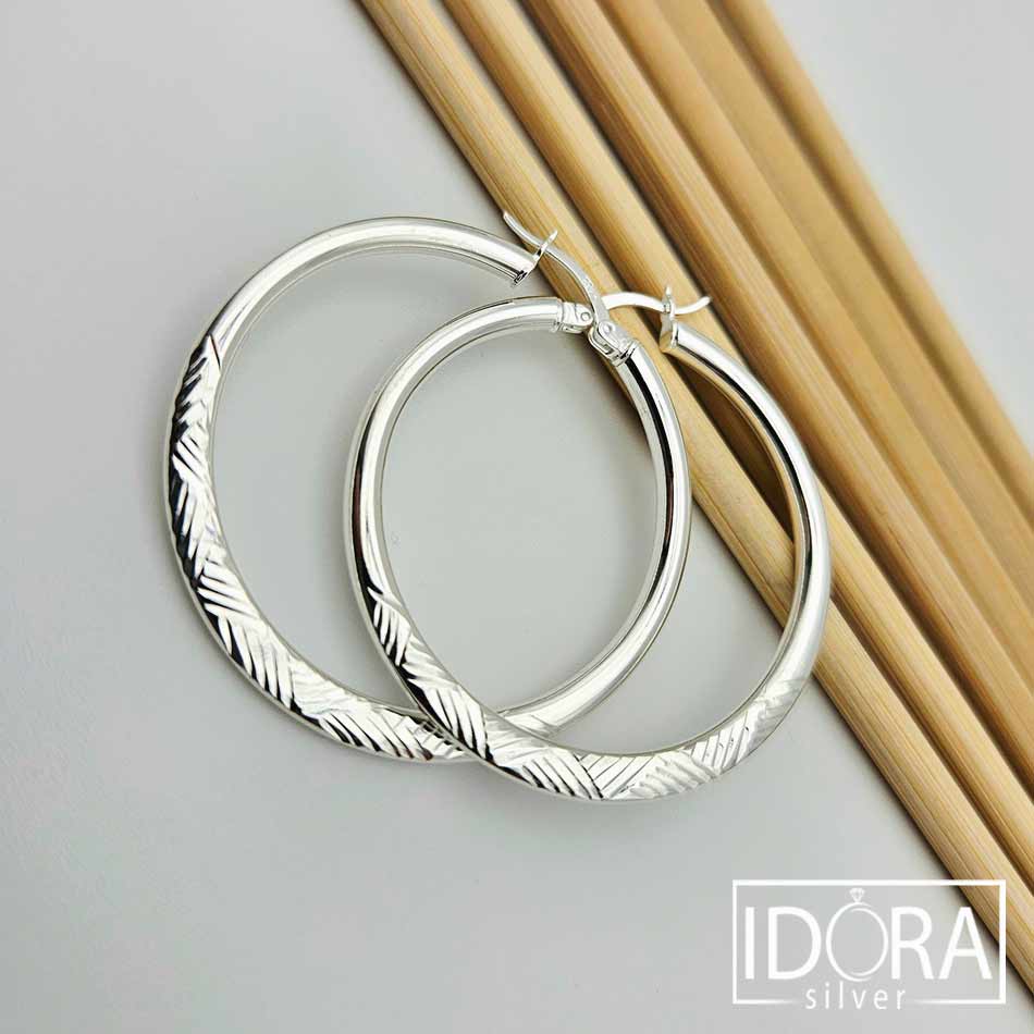 Масивни халки с повърхност улавяща светлината във фин ритъм от гравирани линии, галантно балансиращи между строгост и нежност – дизайн, носещ усещане за стил и тиха увереност.