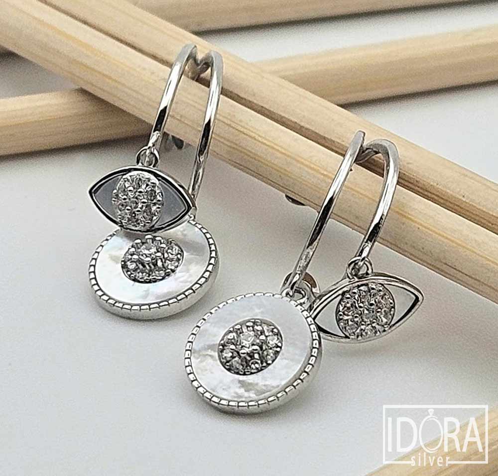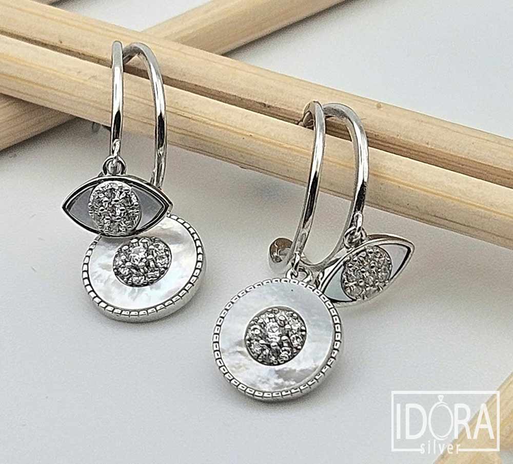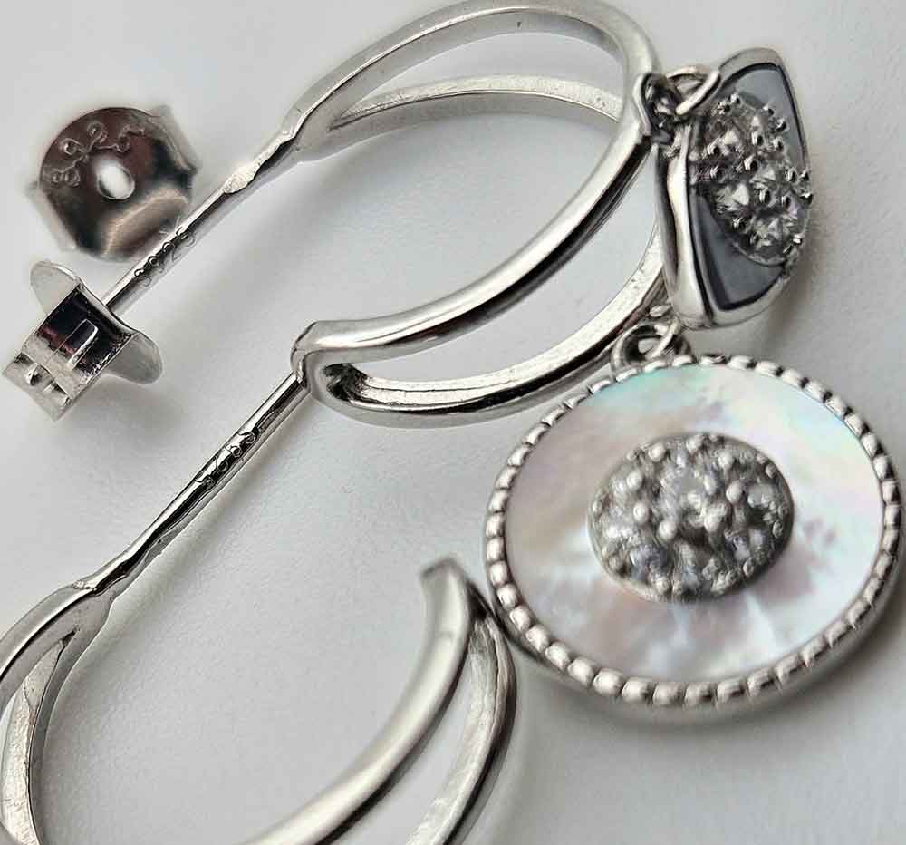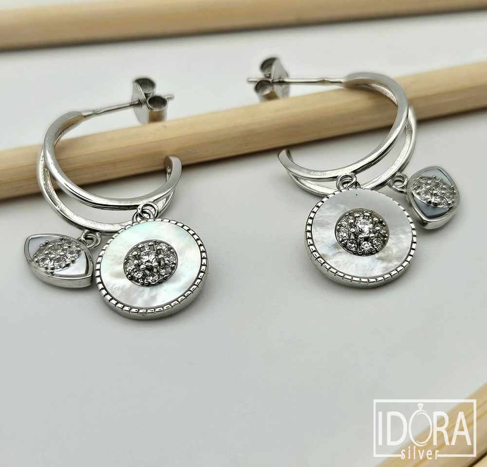 БЯЛ СЕДЕФ с инкрустирани мини ЦИРКОНИ в двойка подвижни елементи, потрепващи в лицевата част на двуредови отворени халки. Италиански дизайн, събрал минималистичен ефект и деликатно загатната символика.