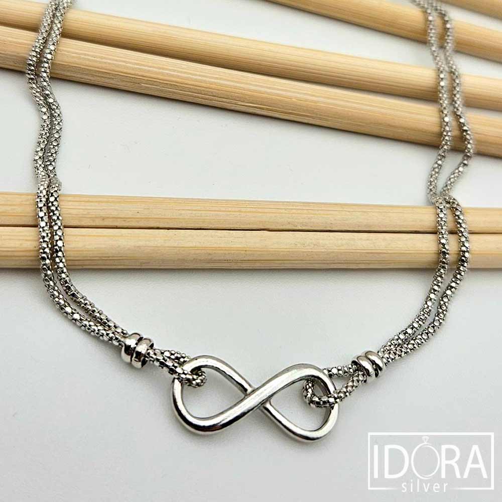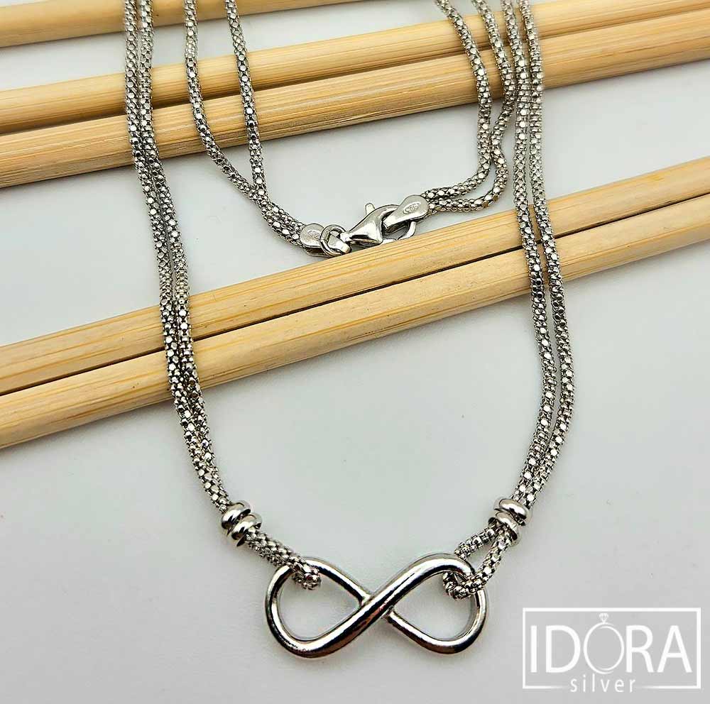Символът на безкрайността оживява в изискано италианско колие – вечният знак на любовта, вярността и хармонията. Двойните фино изплетени верижки се преплитат с грациозна лекота, създавайки усещане за безвремие и духовна свързаност. Всяко движение отразява нежна игра на светлина, която подчертава чистотата и елегантността на изработката. Това колие е съчетание от модерна естетика и неподвластна на времето красота – украшение, което носи не само блясък, но и послание за вечна обич и баланс.
