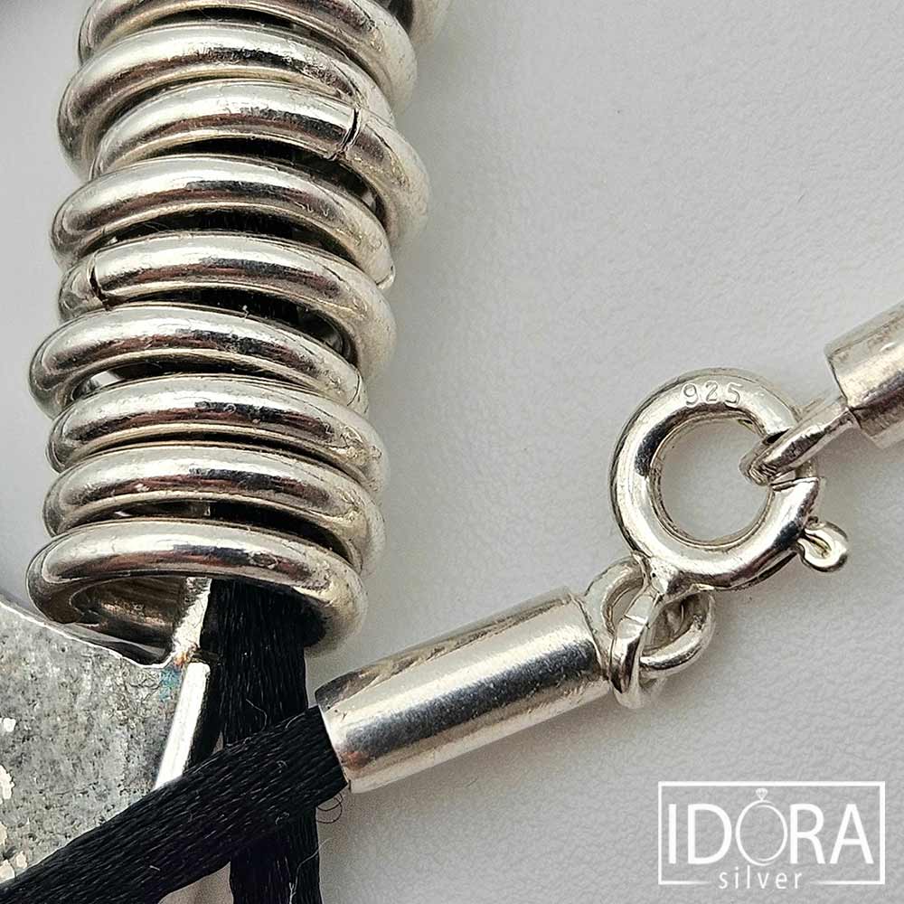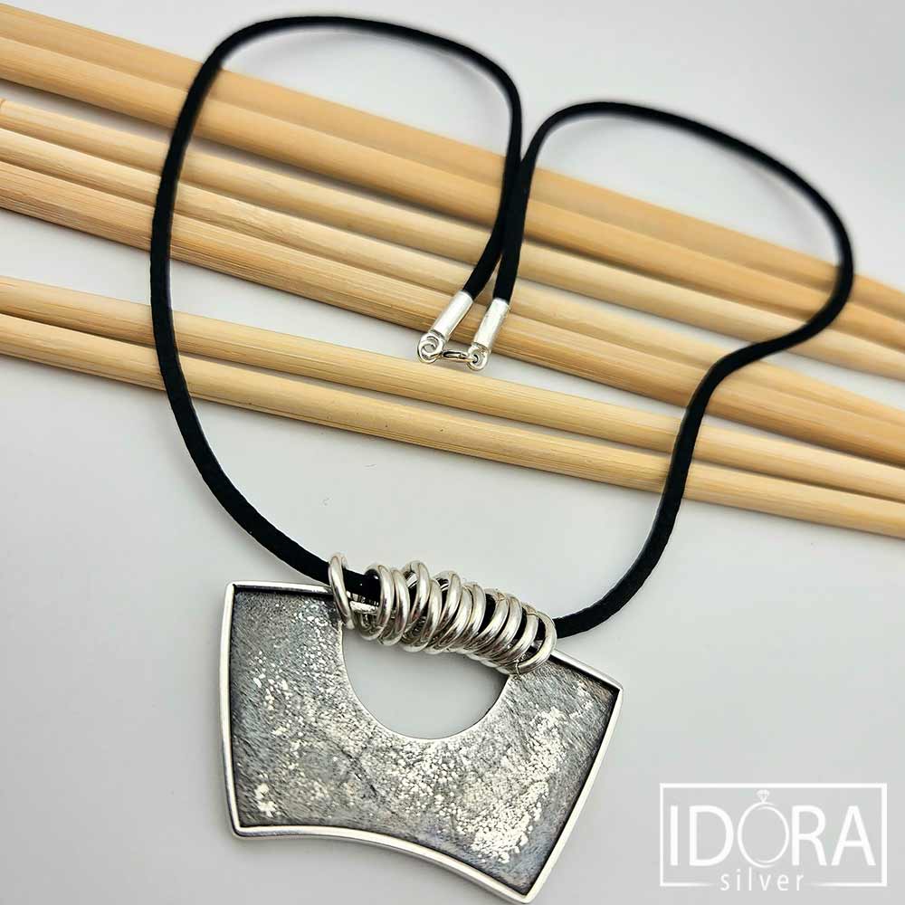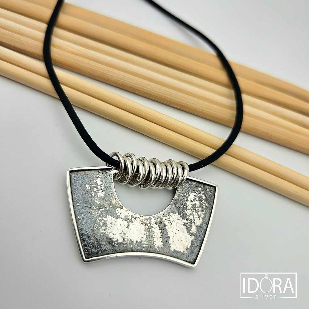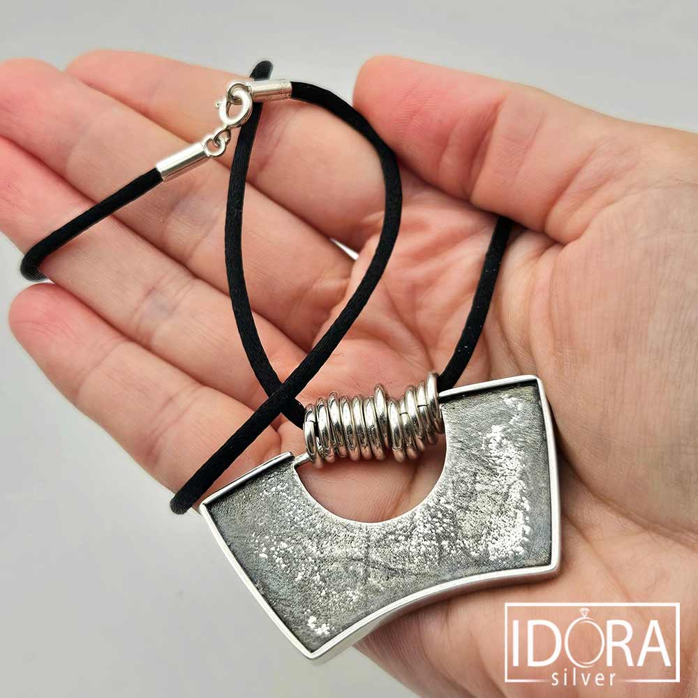 Авторски модел основан на сурова текстура, умишлено запаметила следи от време и природа – повърхността запечатва играта на светлина и сянка. Формата е едновременно строга и плавна, отворът в центъра придава въздушност и баланс. 12 гладки, подвижни сребърни халки нежно свързват черния копринен шнур с масивния двулицев медальон – контраст между мекото и силното, между матовата дълбочина и сребърния блясък. Тази хармония превръща колието в символ на устойчивост и движение, на модерна естетика и непринудена елегантност.