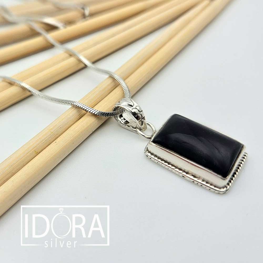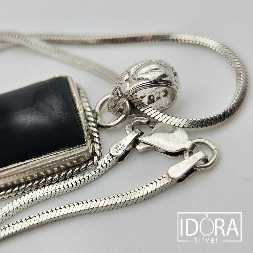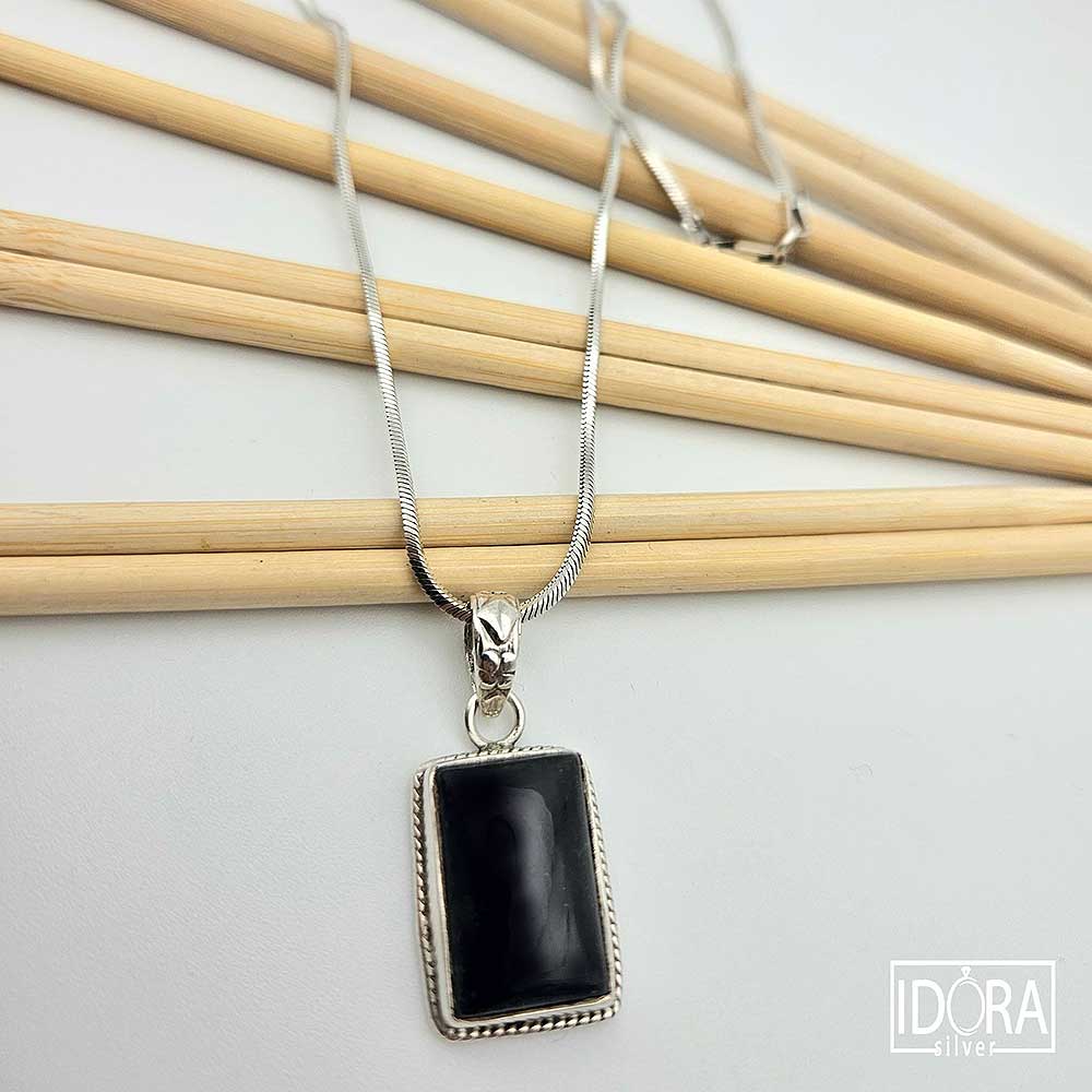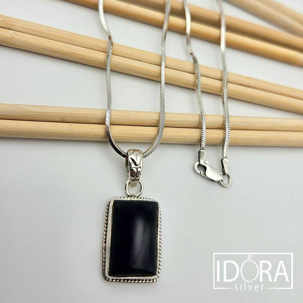 ЧЕРЕН ОНИКС в правоъгълна форма, инкрустиран в рамка с декоративен кант, внасящ усещане за мистерия и напомнящ ръчна изработка. Бейлът също е с деликатен релефен мотив, който добавя артистична нотка и подчертава ръчното майсторство. Сребърната верижка тип „змийска“ (snake chain) допълва визията с модерна гладкост и изтънченост – фин баланс между съвременен минимализъм и класическа изтънченост.