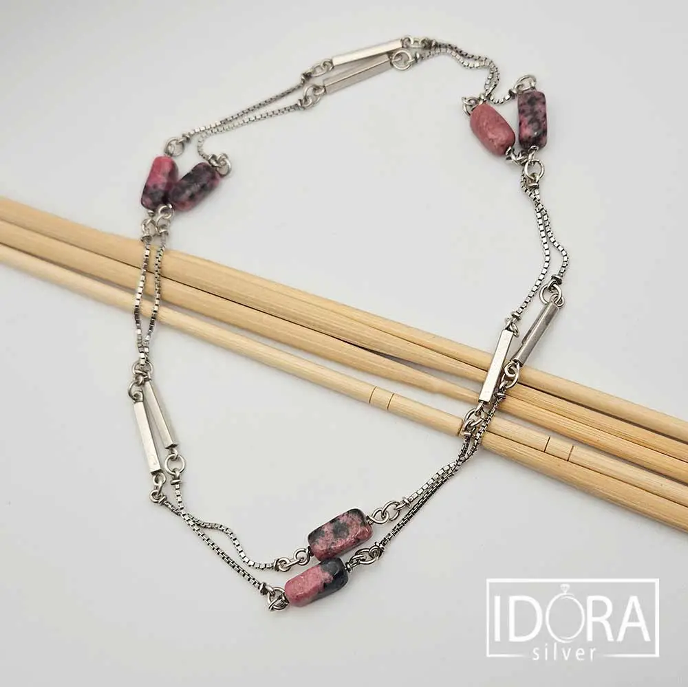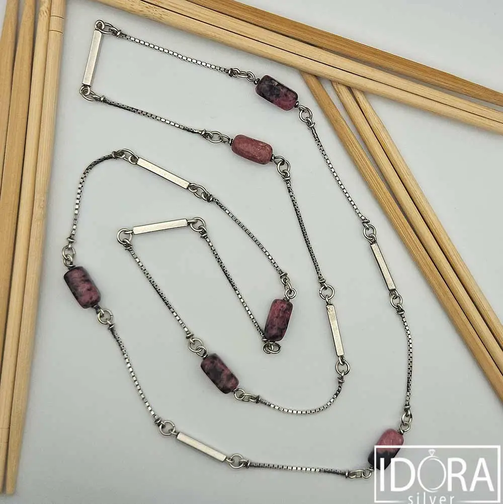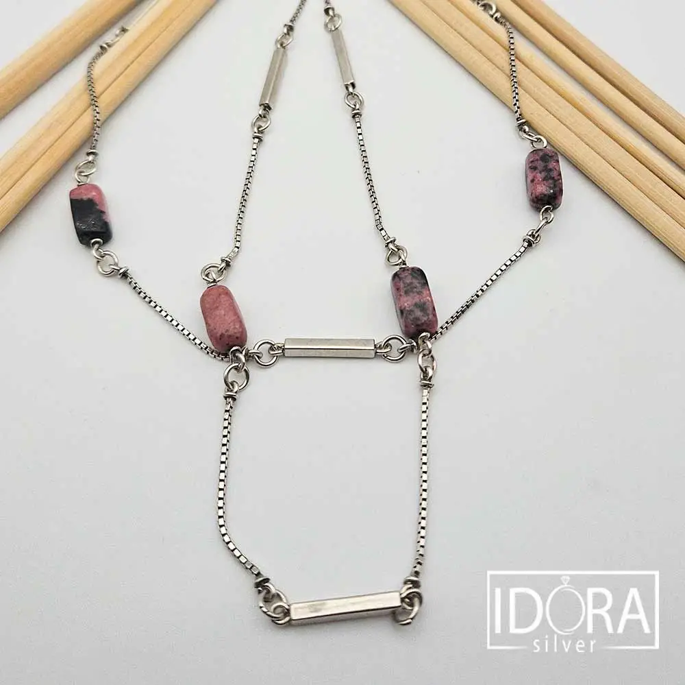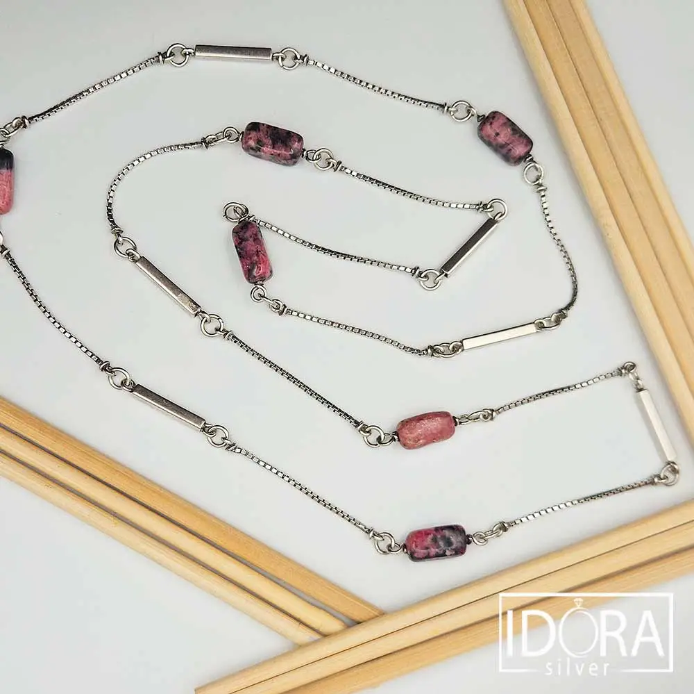 Поредица от естествени родонити, умело комбинирани със сребърни елементи, се преплитат във впечатляващо авторско колие. Всеки камък носи своя уникална текстура и мек розов оттенък, създавайки хармония между нежност и сила. Среброто, вплетено в композицията, подчертава естествената красота на родонита и придава усещане за завършеност и стил. Това колие е не просто украшение, а израз на индивидуалност – изящен акцент, който носи енергия, женственост и артистичен дух.