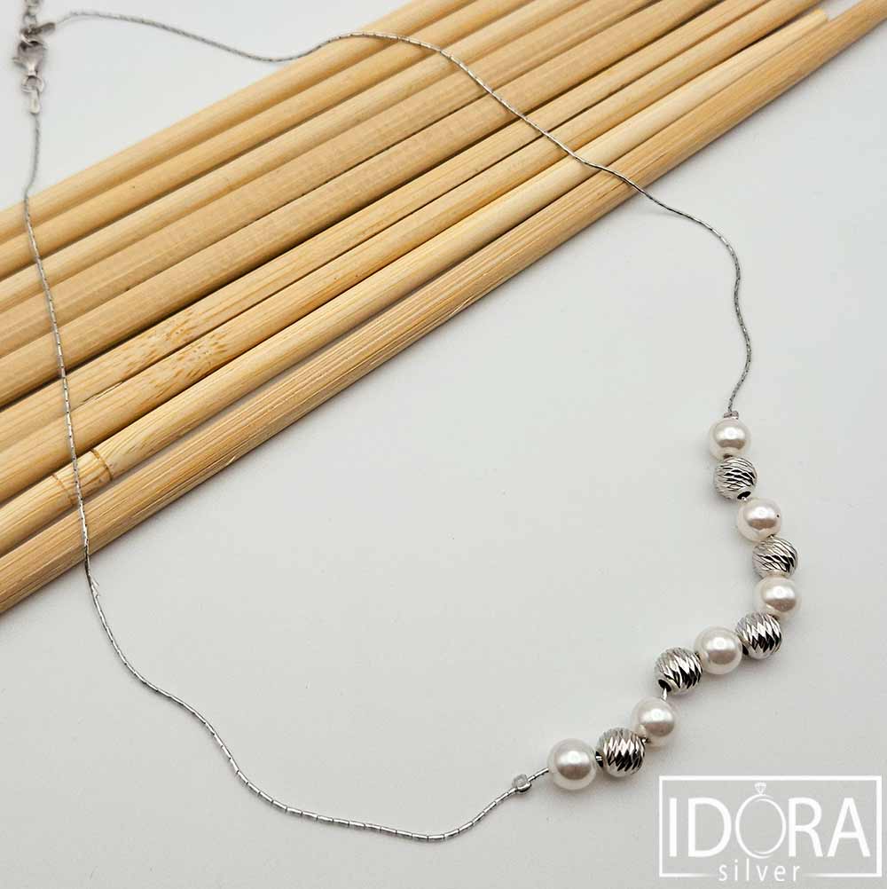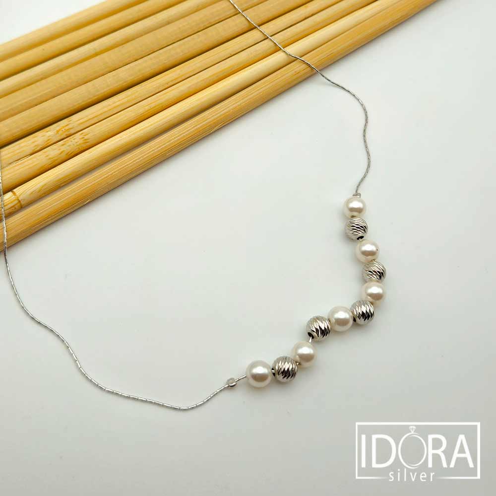 Изящно колие от сребро и перли, артистично подредени върху фини сребърни верижки – преплитането на класически перли с елегантно гравирани сребърни сфери, създава усещане за синхрон в традиция и модерна естетика.