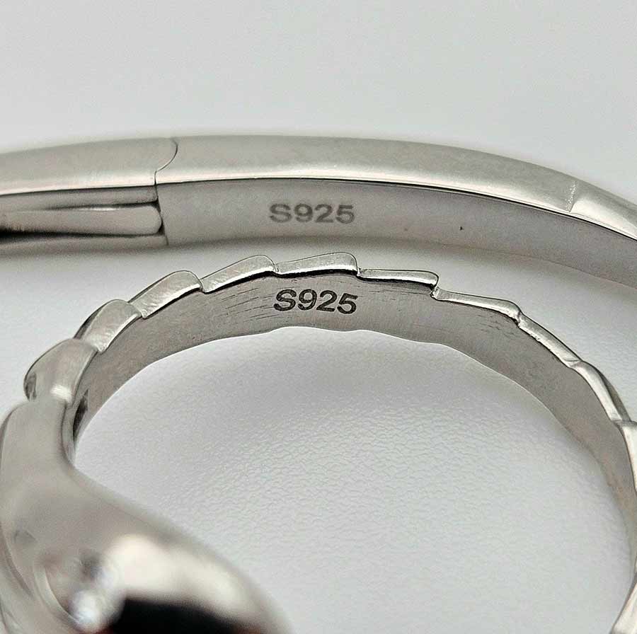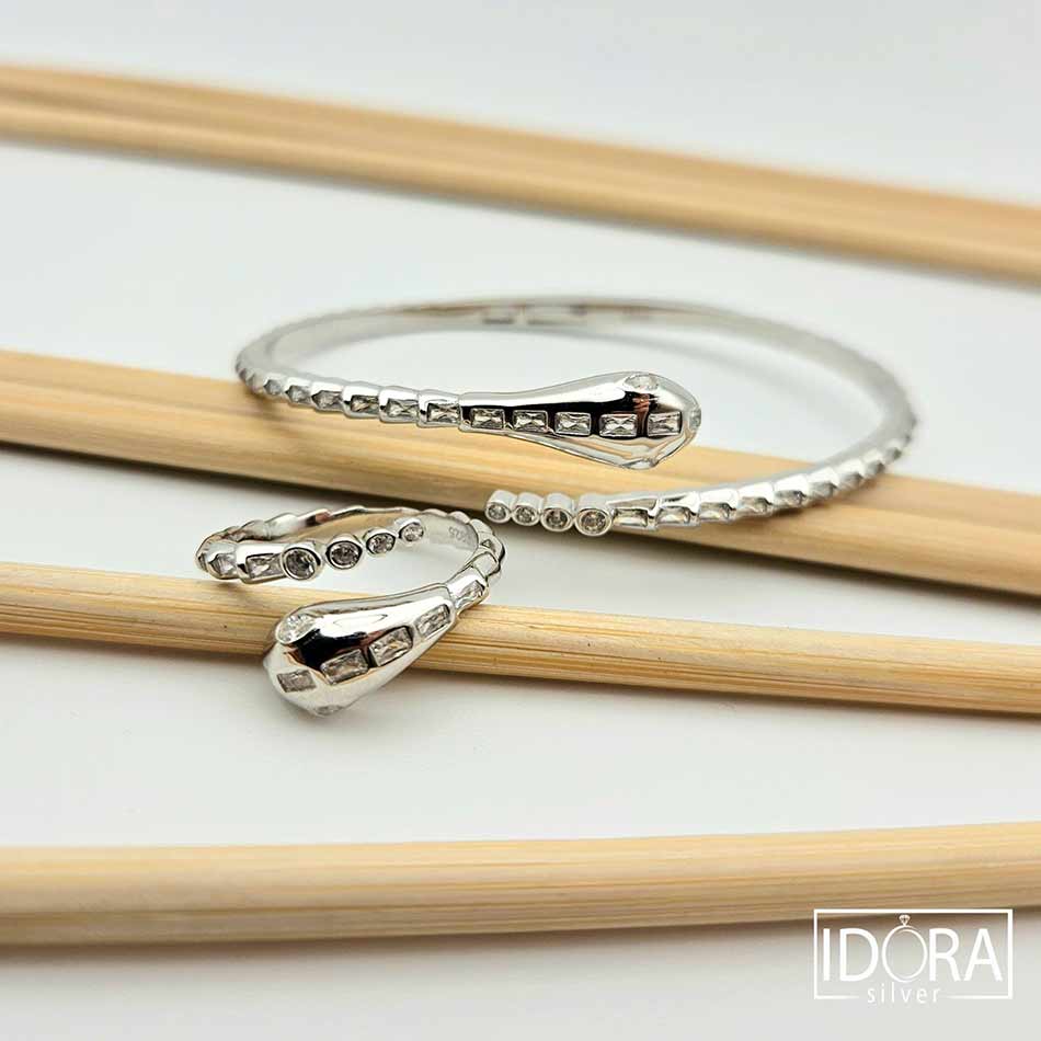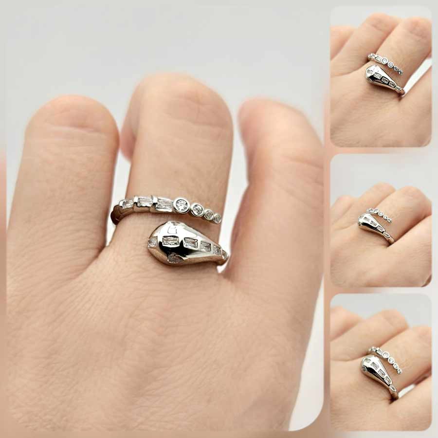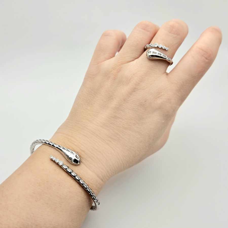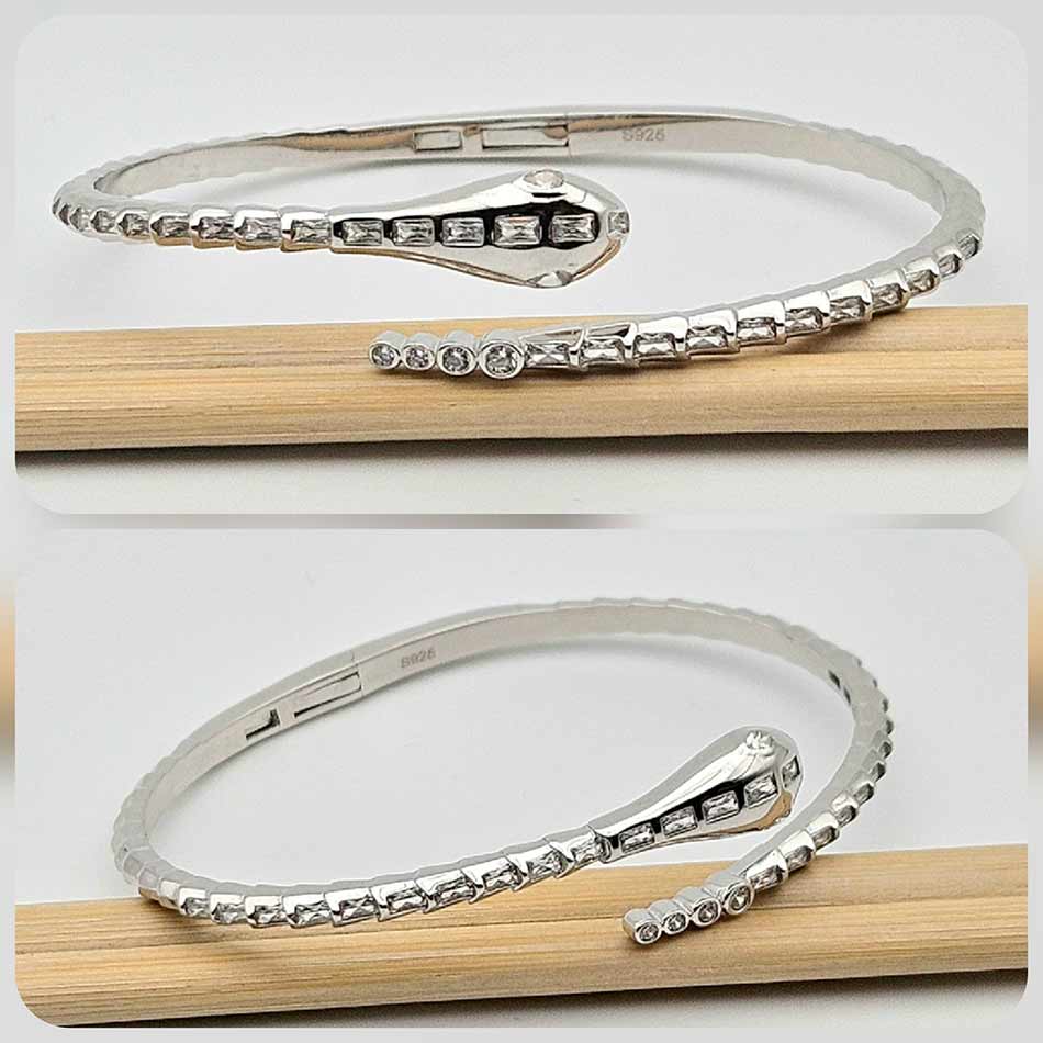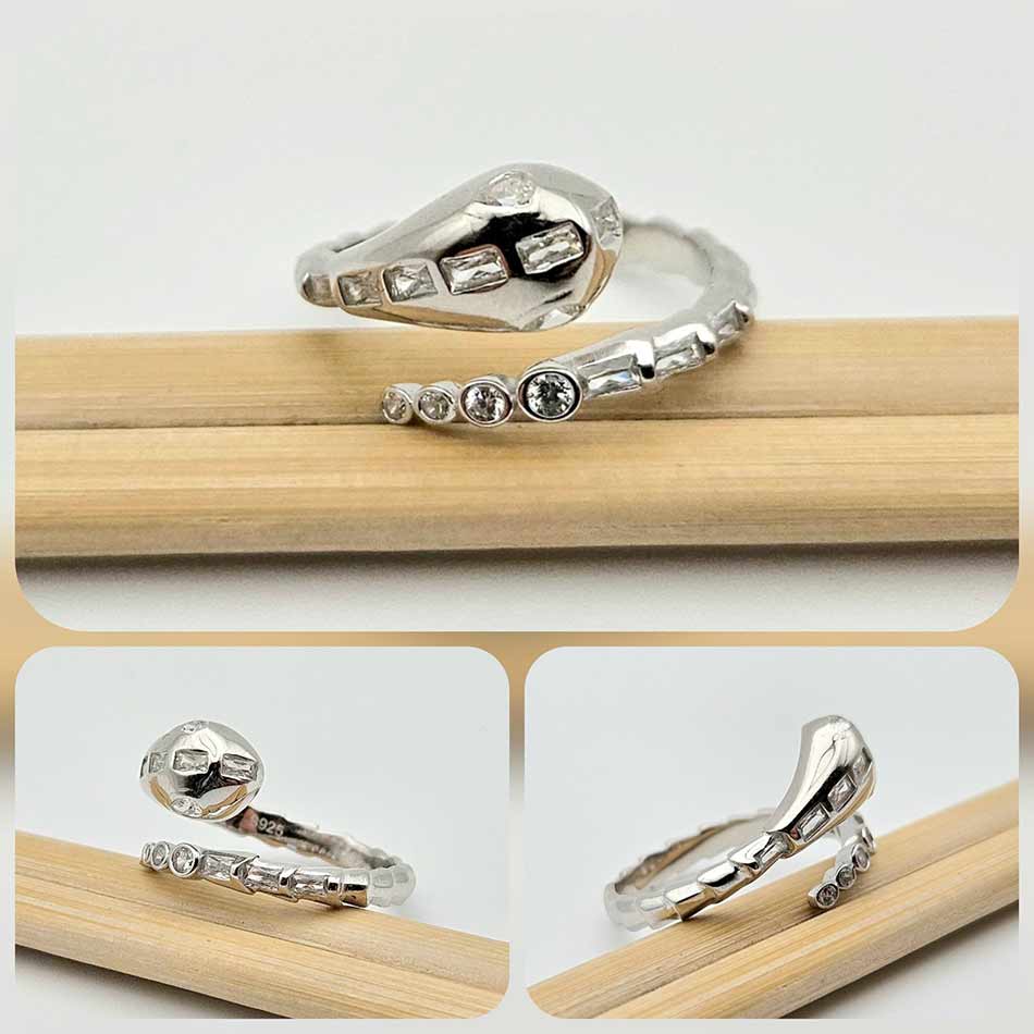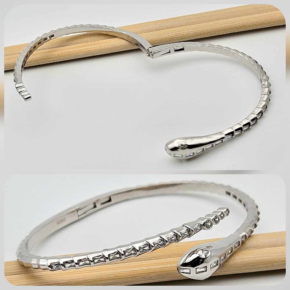 Стилизирана арт фигура на змия с дизайн носещ модернизъм, гъвкавост и фино напрежение между сила и елегантност – родираното сребро улавя светлината меко, а вградените циркони в различни форми проблясват като скрити тайни, подредени в ритъм.