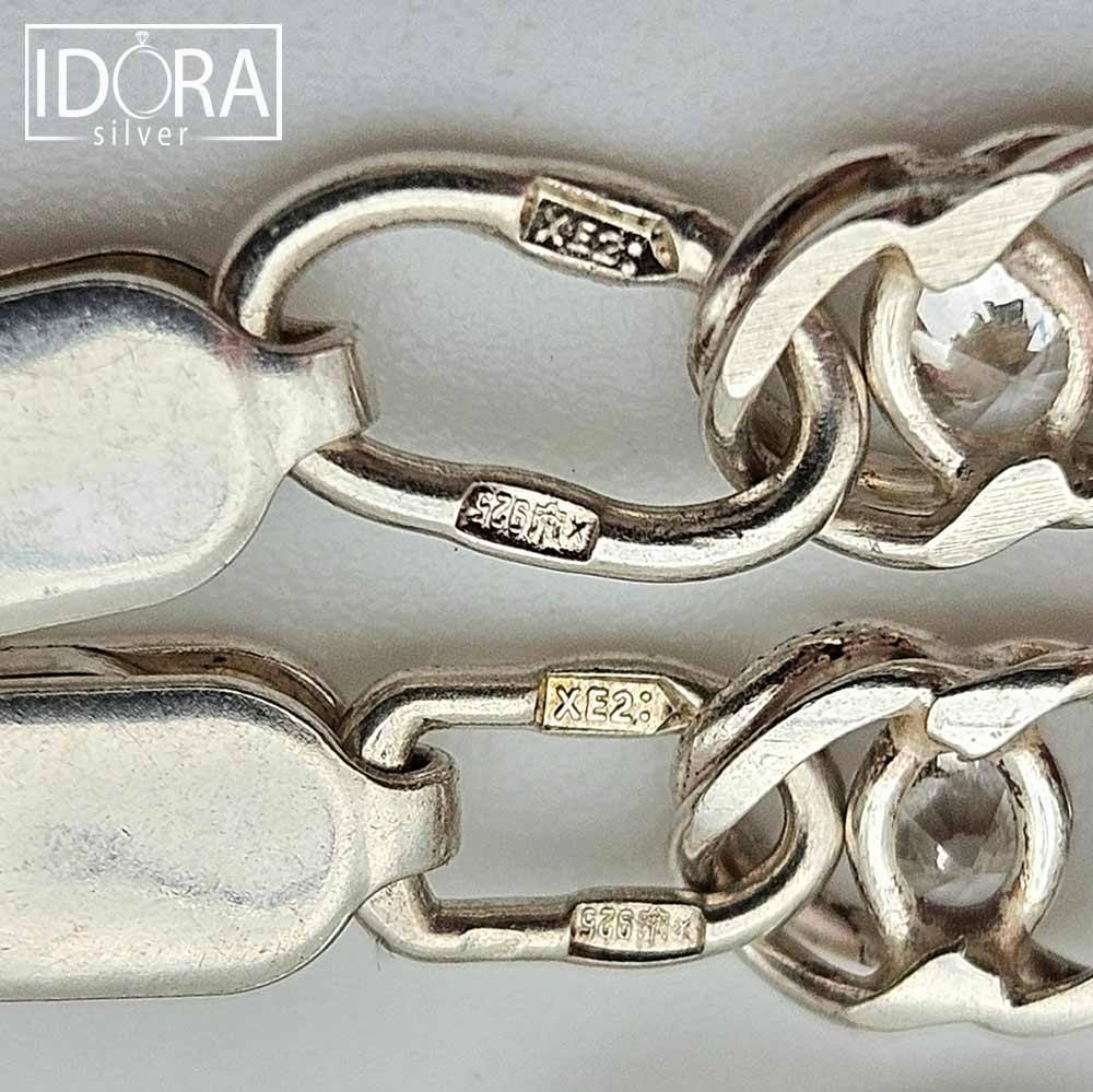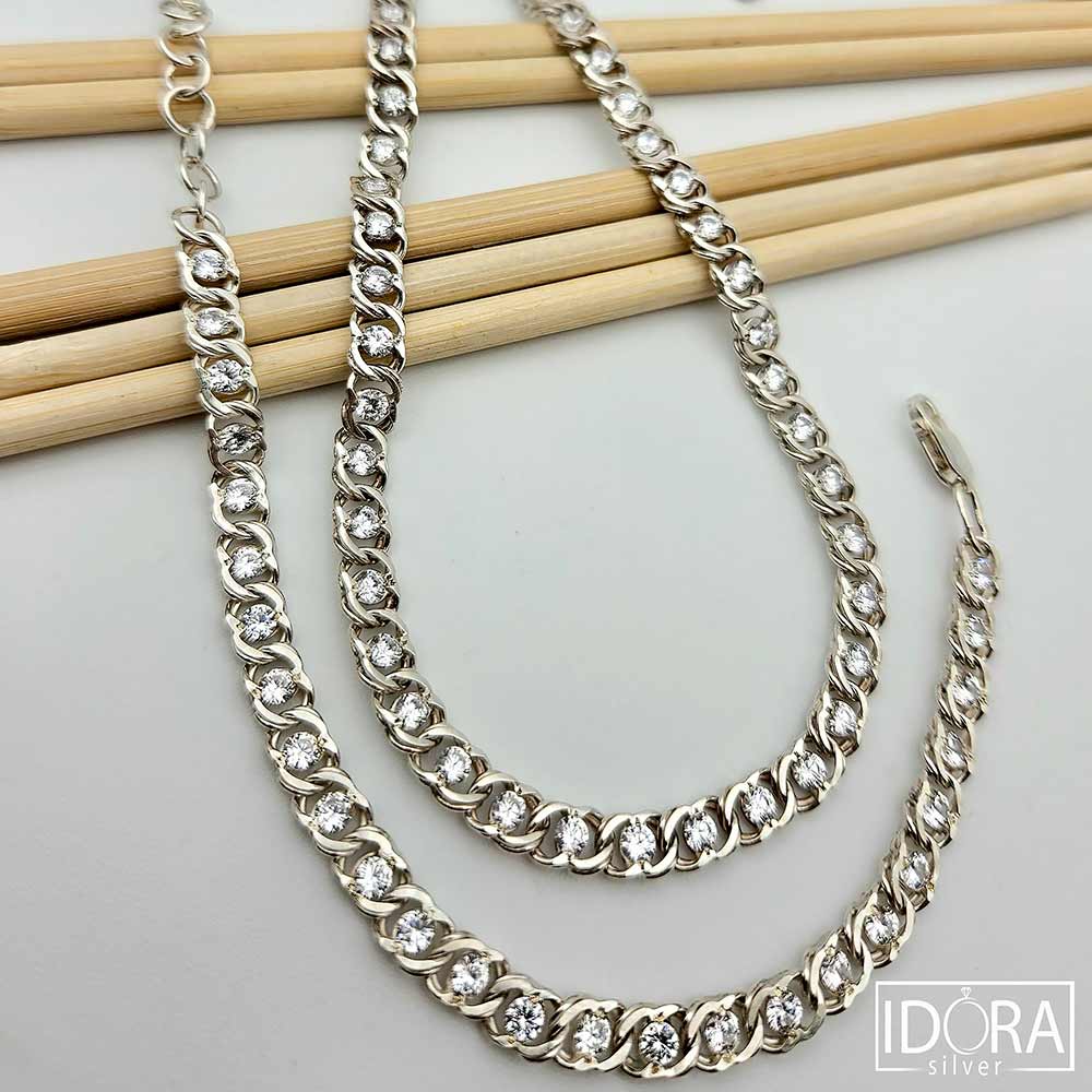 Изящен комплект с претенция за италианска уникалноат, състоящ се от колие и гривна с инкрустирани блестящи циркони. Всяко звено във верижката прегръща камъче, придавайки усещане за непрекъсната елегантност и изтънченост, създавайки впечатление за живо движение и блясък. Една истинска поема за красотата на среброто и искрящата енергия на светлината.