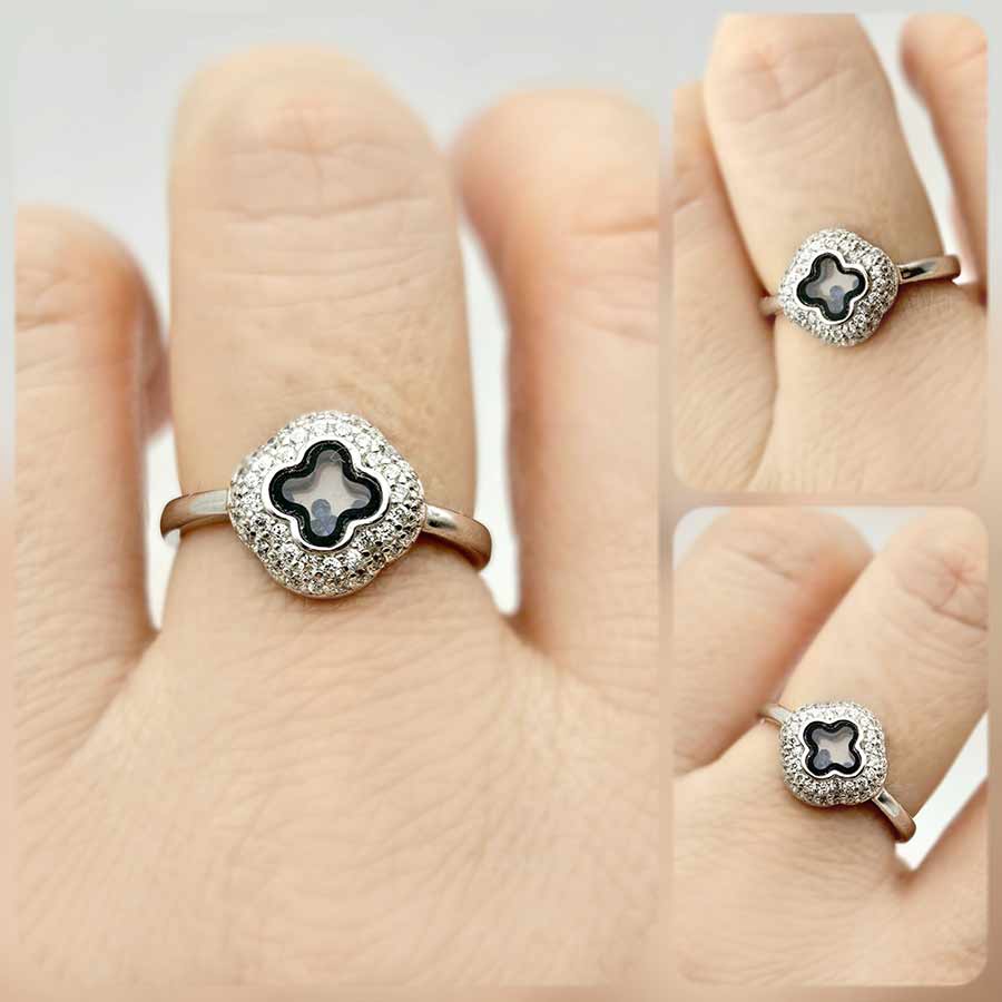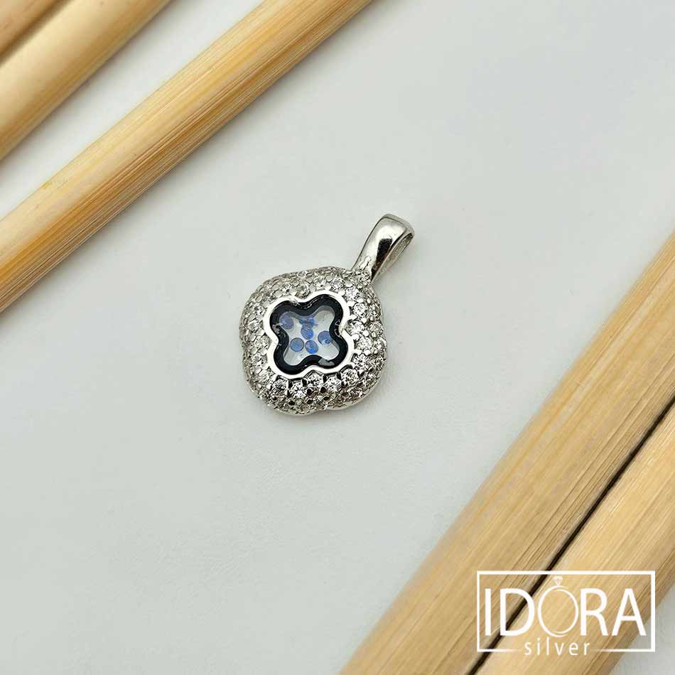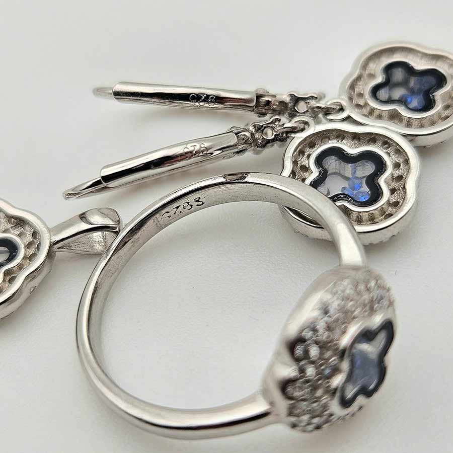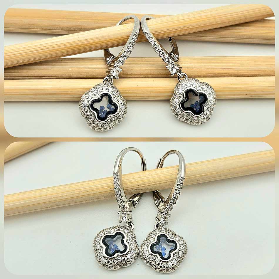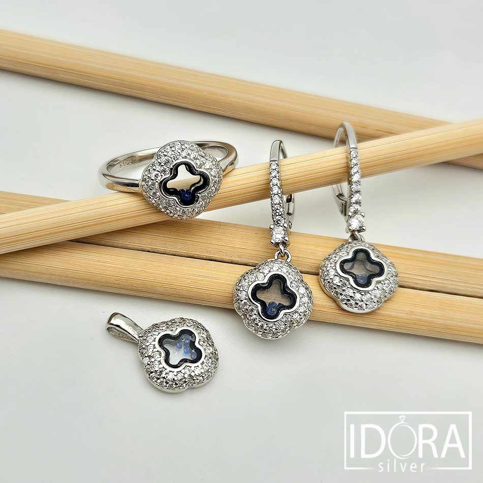 Стилизирана форма, напомняща четирилистно цвете и миниатюрна звезда с прозорец, скрил дълбокосин акцент като уловени и запечатани, пръснати капки нощно небе, рамкирани от множество блестящи циркони.