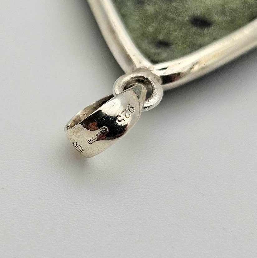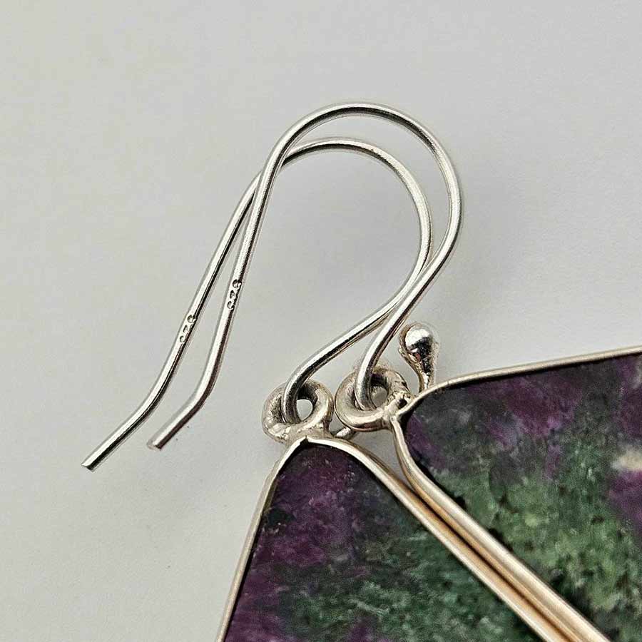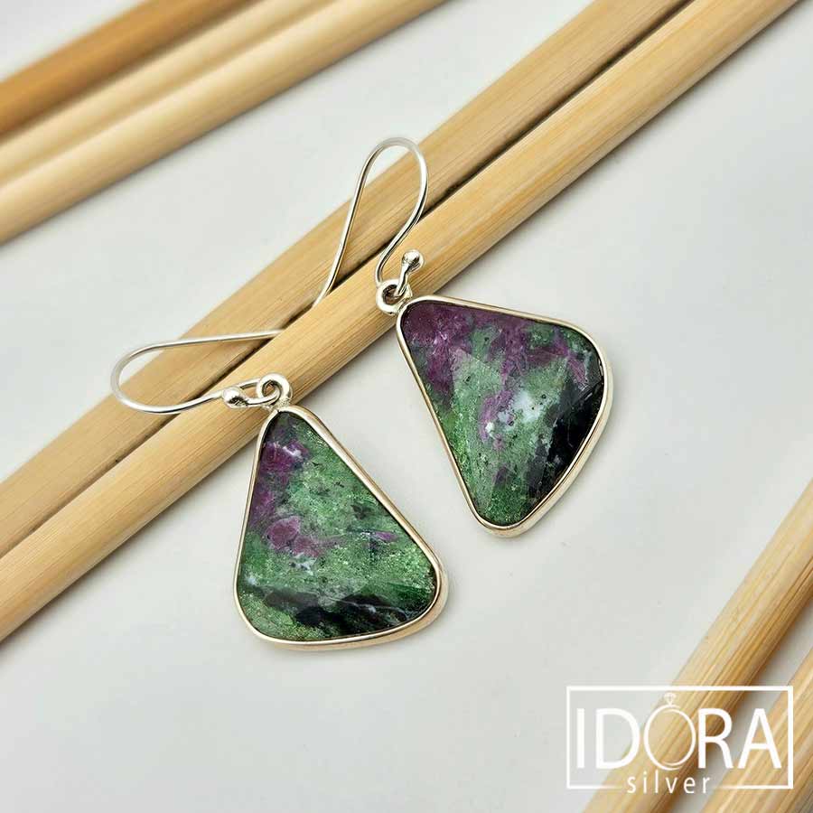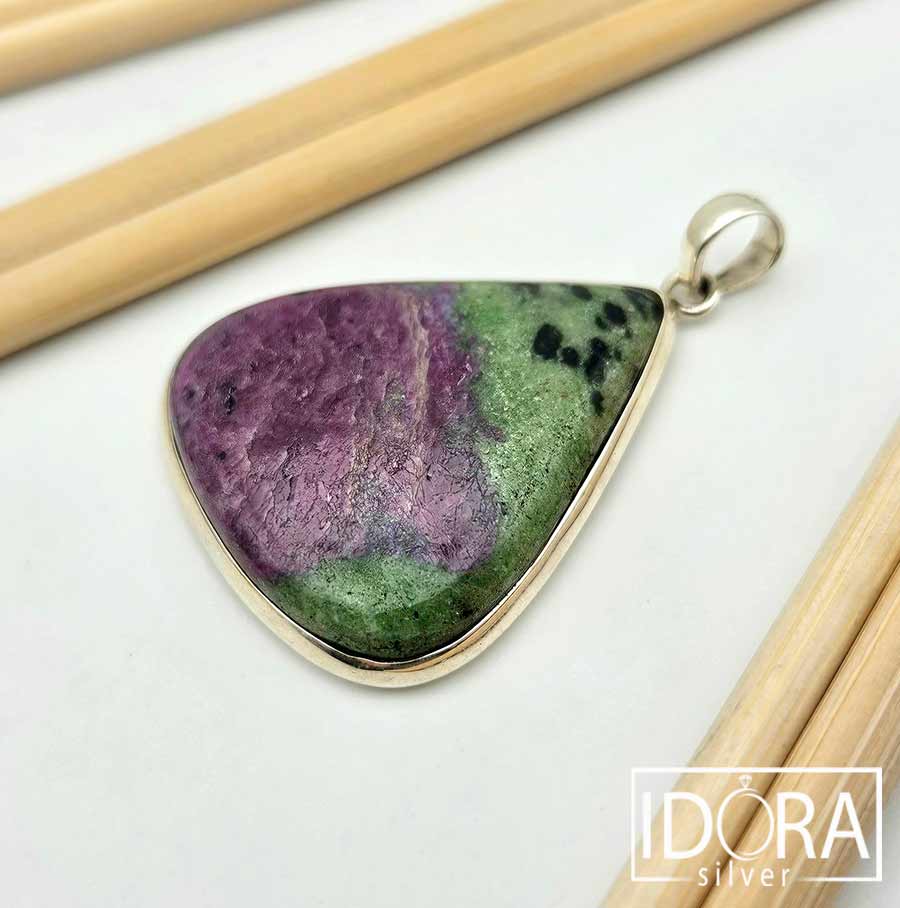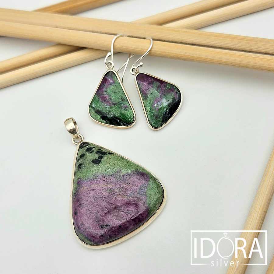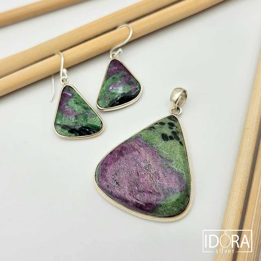 Естествен камък РУБИН В ЦОИЗИТ (аниолит), с неповторими преливащи нюанси, семпло обрамчен в сребро – всяка плочка е оформено в органична, триъгълна форма, която подчертава естествената структура на минерала, деликатно подчертана от сребърната рамка, добавяща изискан завършек, без да отвлича вниманието от живописната текстура на камъка.