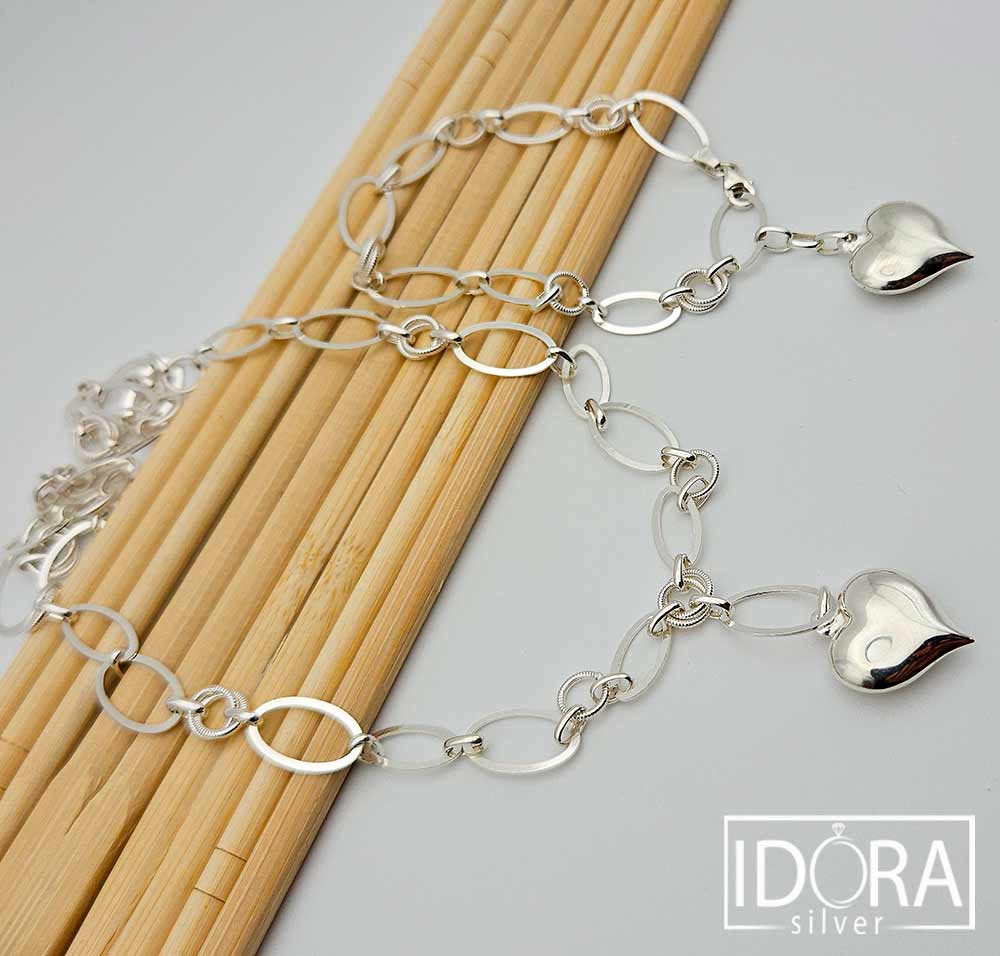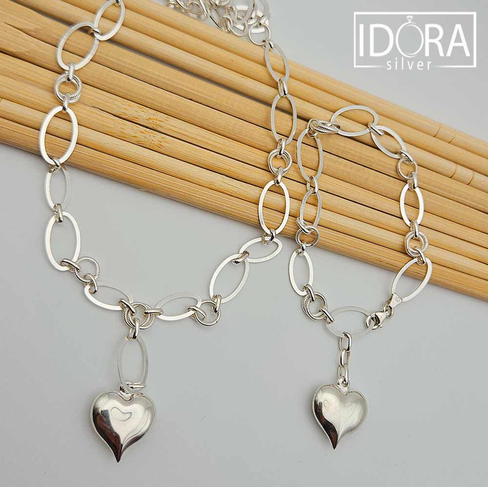 Изящност с внимание към детайла, пълна с усещане за нежност – колие и гривна от елегантно свързани овални халки, чието редуване между гладки и фино орнаментирани елементи напомня за ритъм и хармония. Сърца в роля на акцент, улавят и отразяват светлината в топли отблясъци, пълни с усещане за чистота и романтика, носещи обещание за вечна нежност.