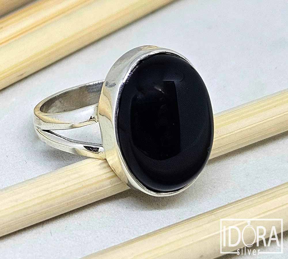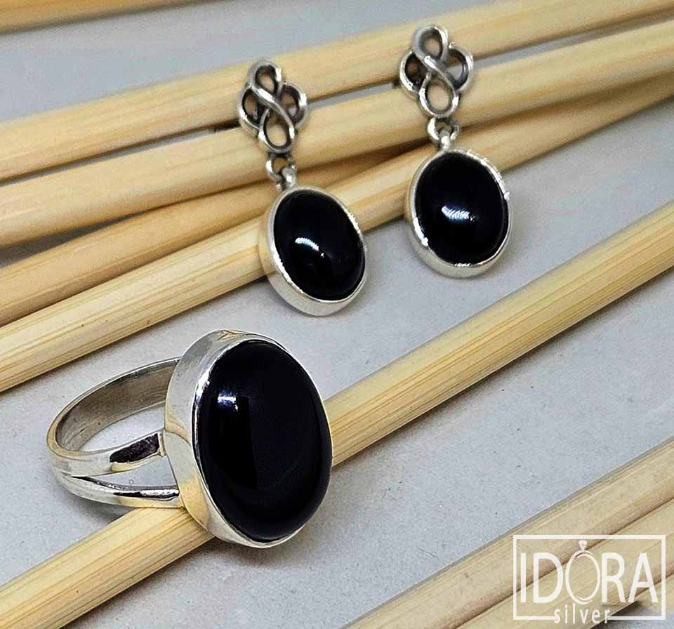 ЧЕРЕН ОНИКС и сребро в семпъл дизайн, съвсем естествено подчертаващ вечно актуалния цвят на камъка. Обеци с потрепващ висящ елемент и пръстен с двойна халка – чудесно съчетание за всеки ден и повод.