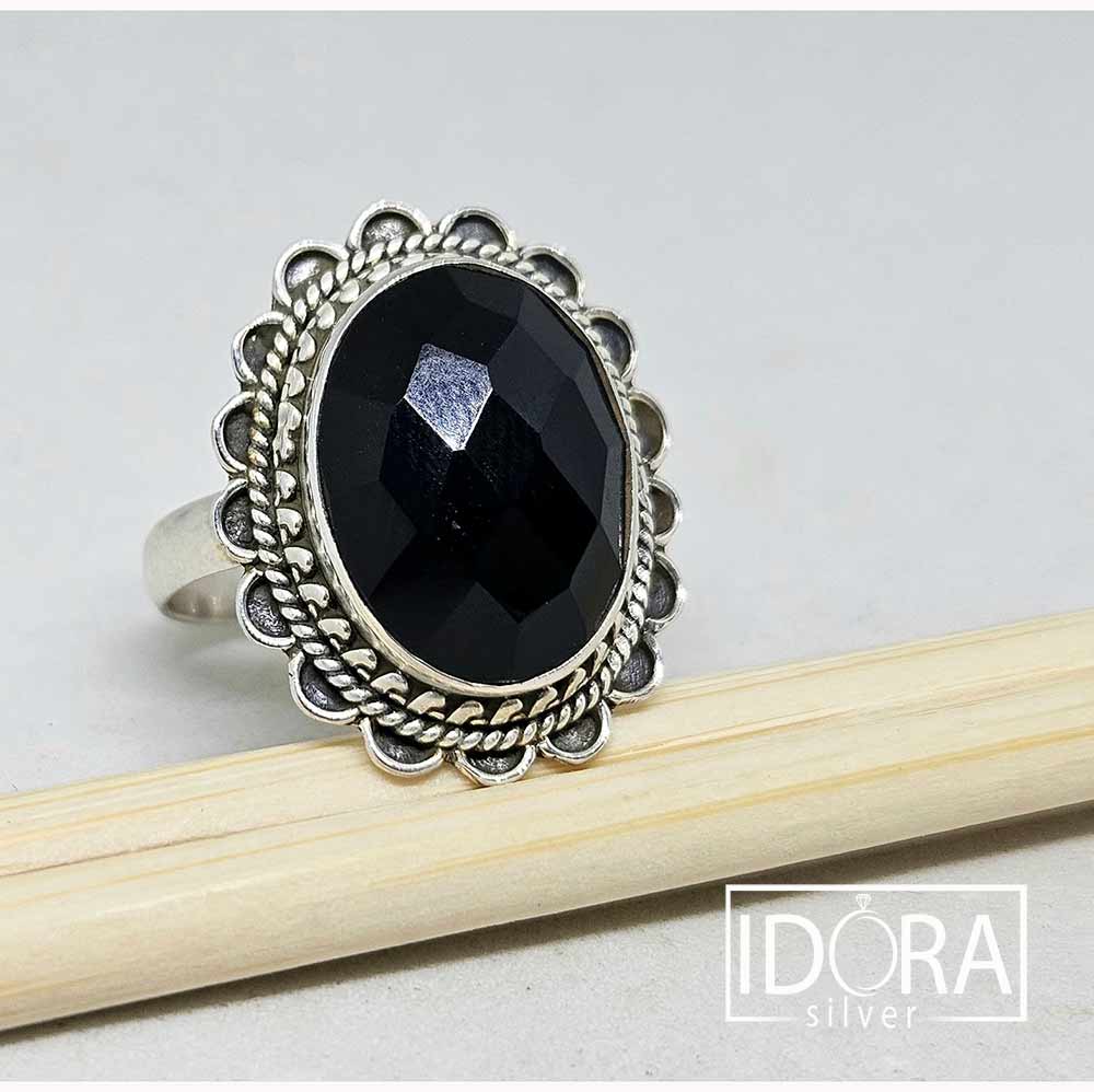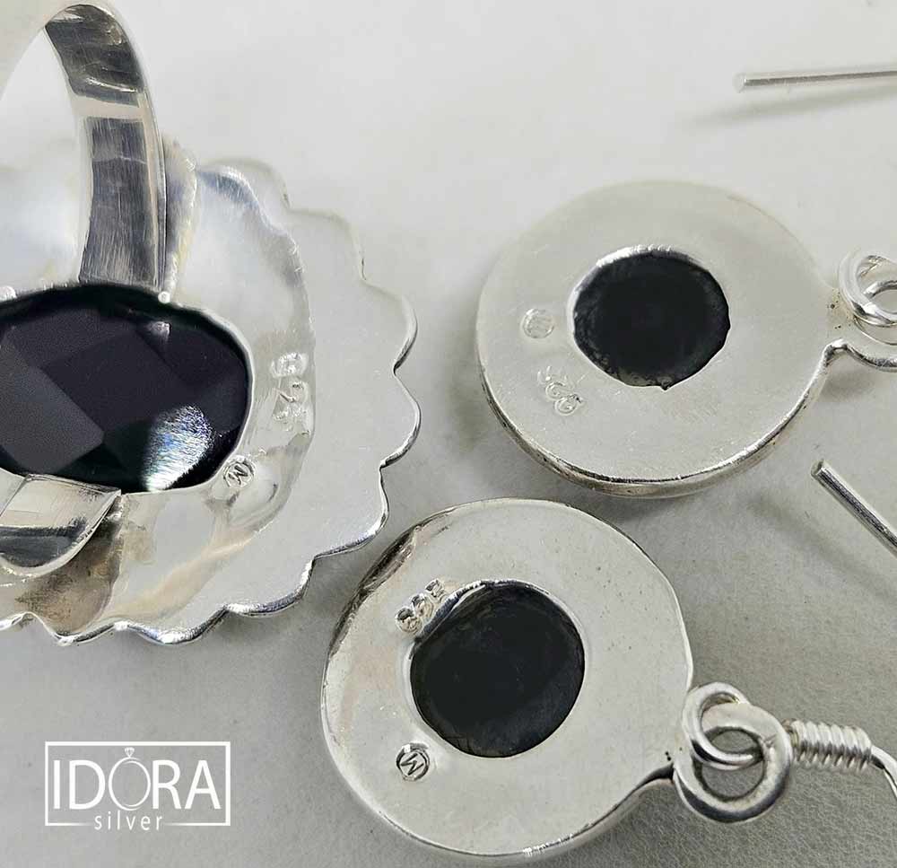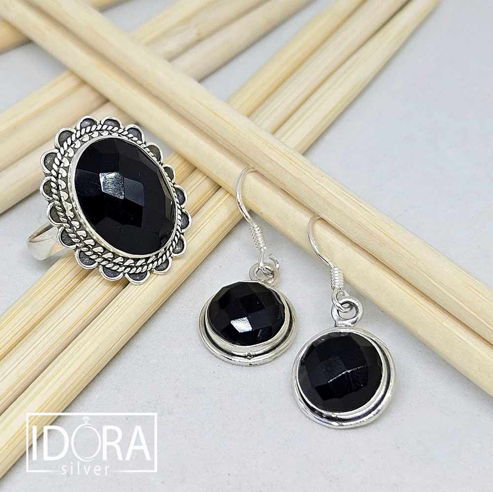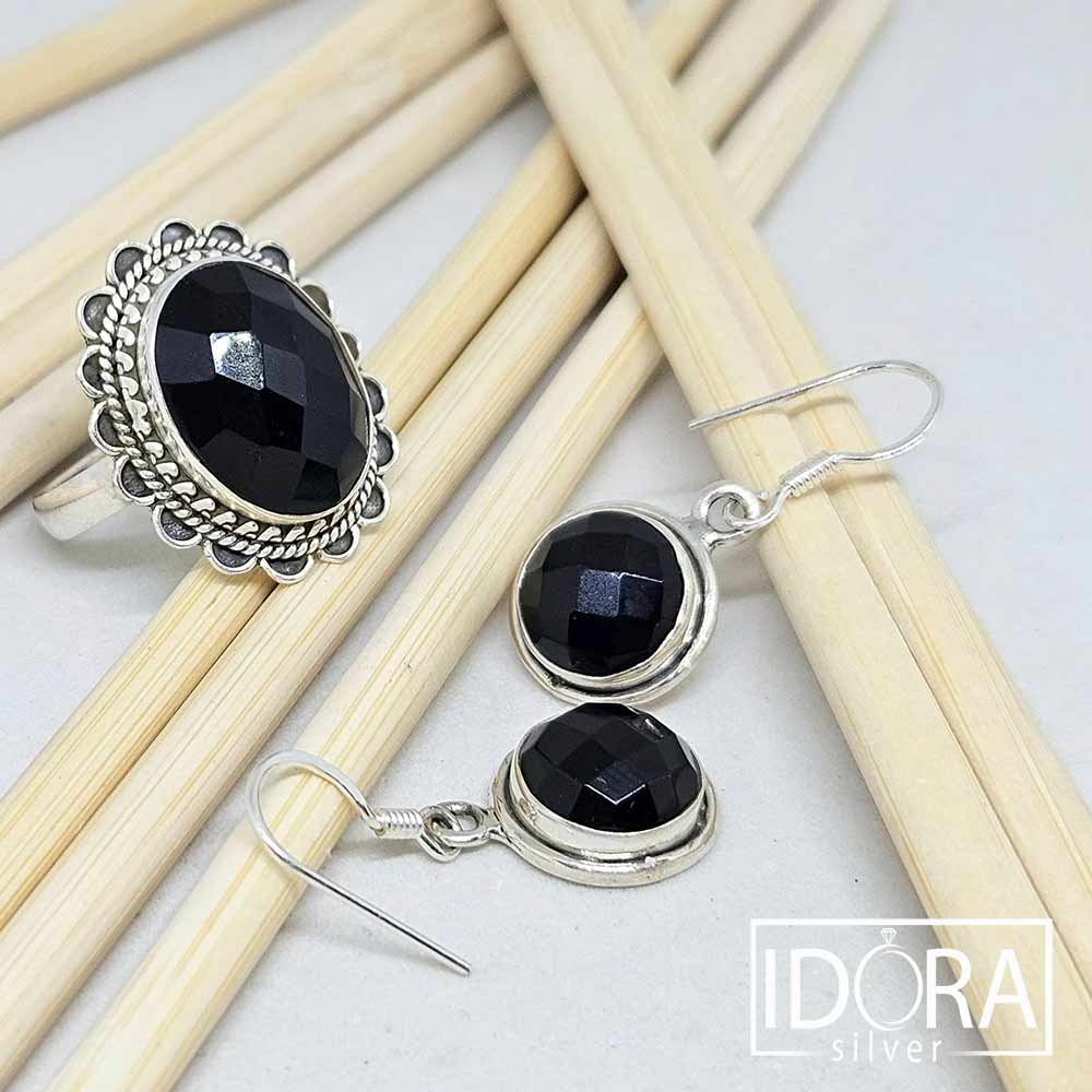 Фасетиран ЧЕРЕН ОНИКС, изненадващ с живия си блясък при игра със светлината. Пленяваща с детайла си корона на пръстена със семпло допълнение от елегантни обеци.