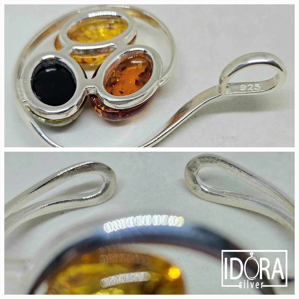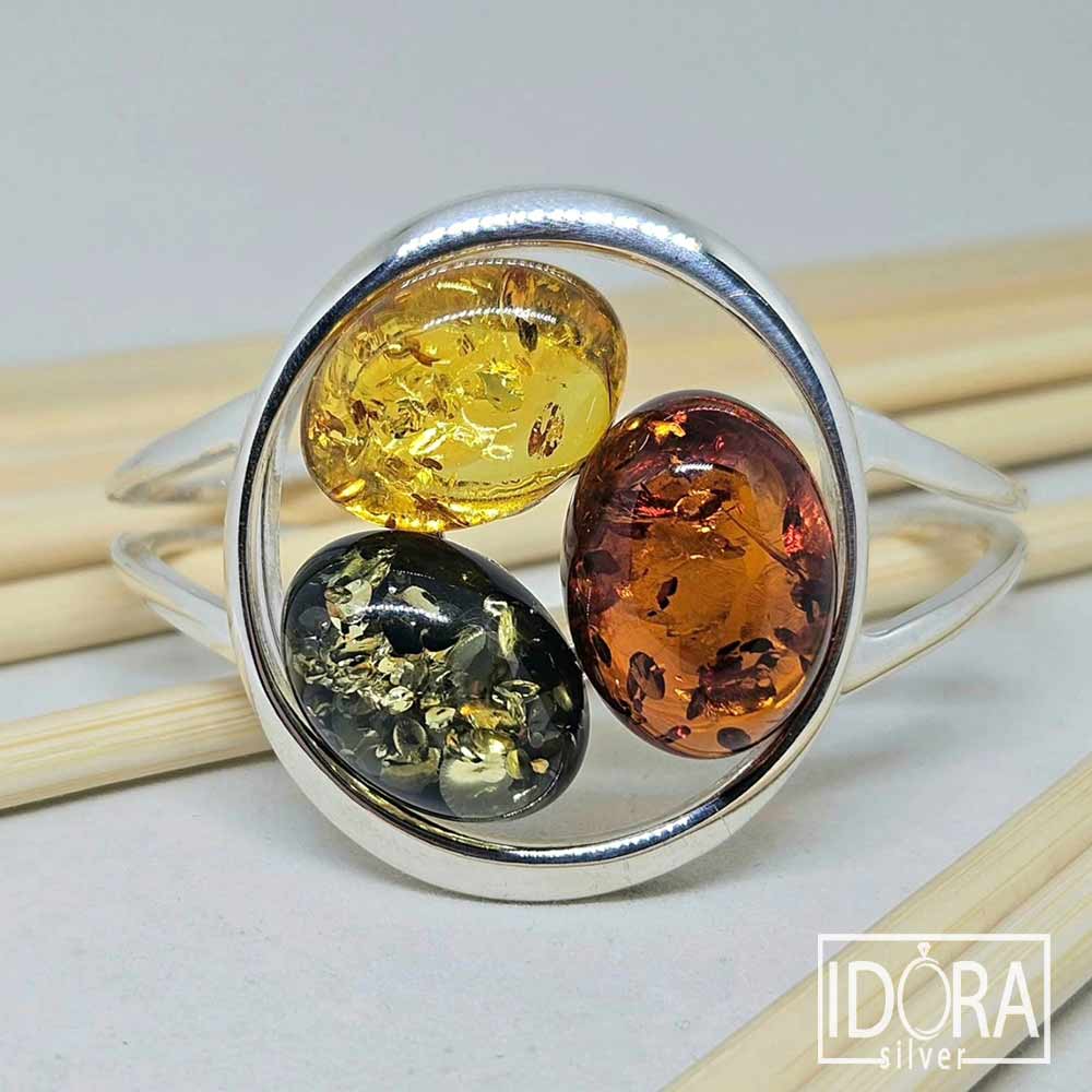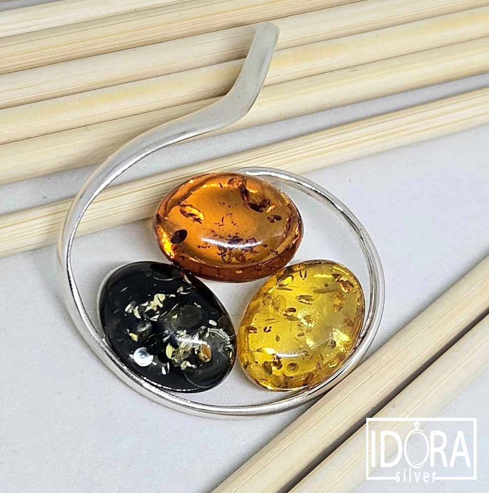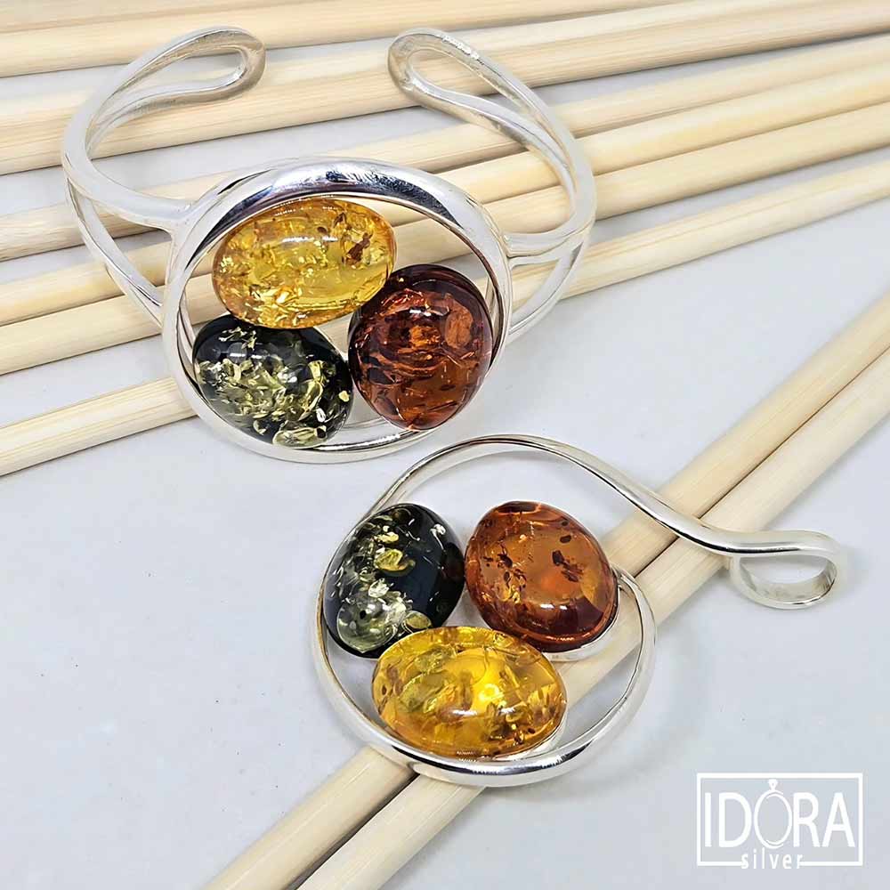 Сребърен трицвет от балтийски кехлибар – разгръщащ естествената си красота като основен акцент в масивна отворена гривна и артистичен медальон. Контрастът между трите нюанса създава усещане за движение на светлината, сякаш слънцето е уловено в различни мигове на своя ден. Сребърната основа обгръща камъните в съвременен, но същевременно вечен дизайн, който съчетава сила, топлота и елегантна хармония.