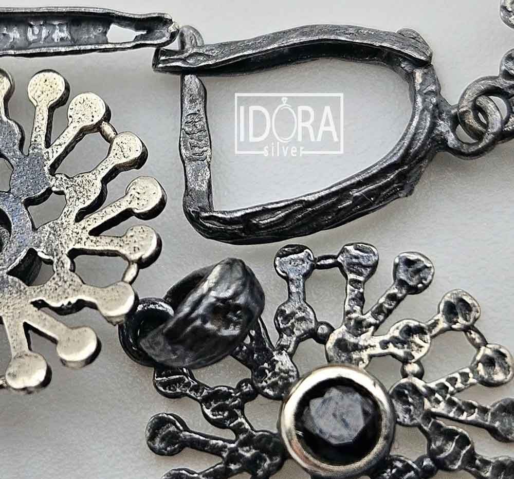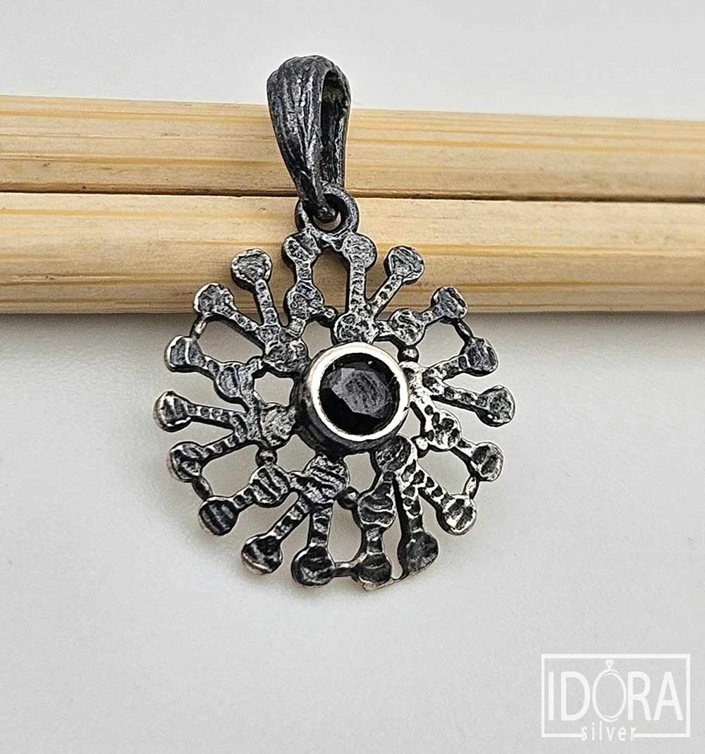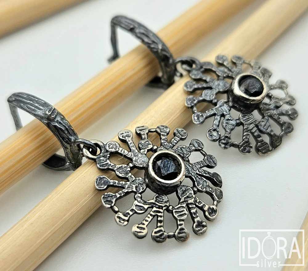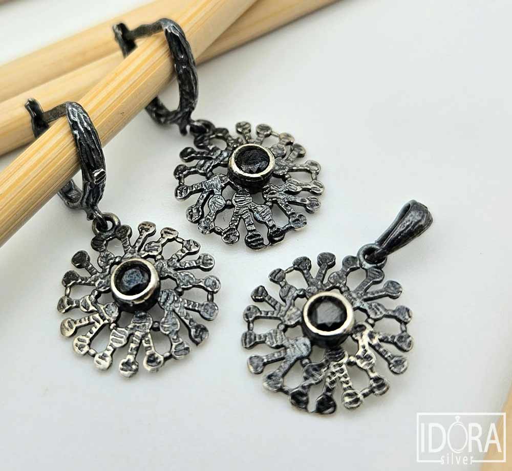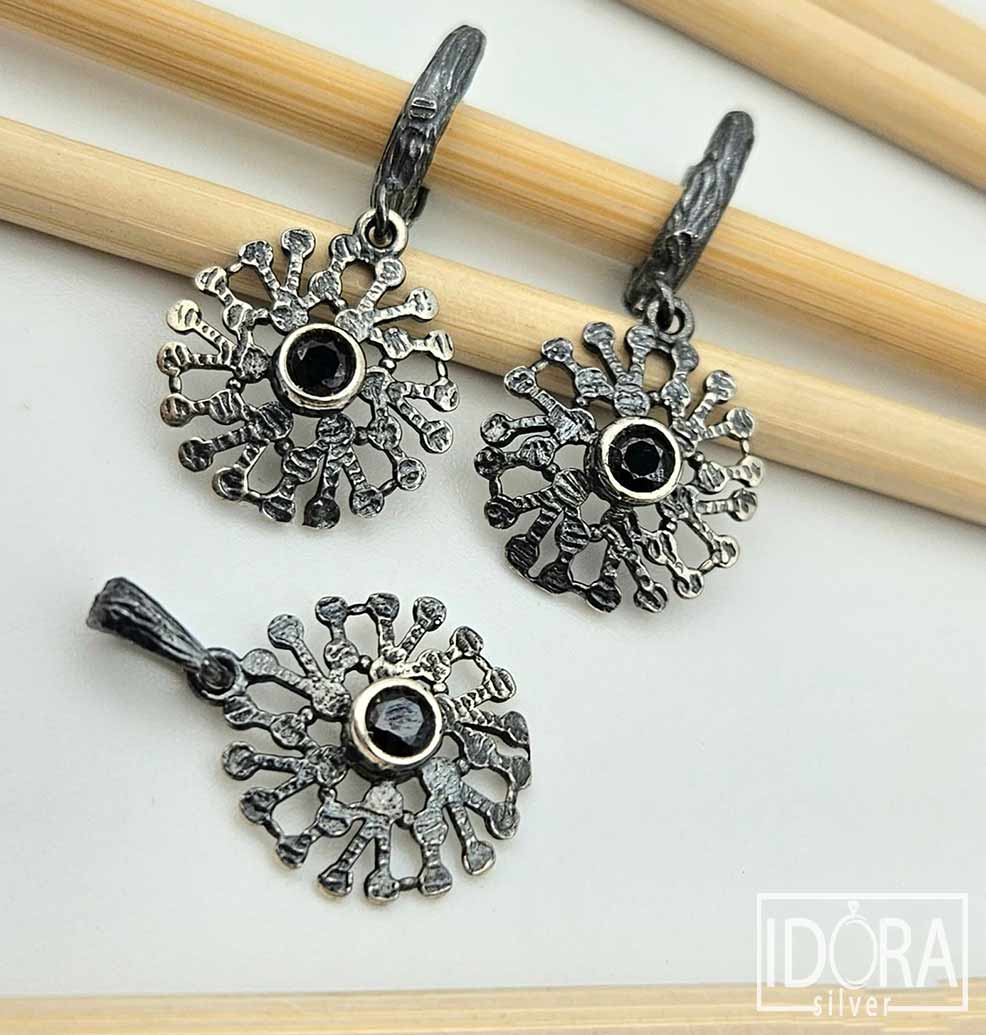 Сребърни обеци и медальон с дизайн, вдъхновен от абстрактни природни форми – едновременно напомнящи за разцъфнали цветя и за кристални структури, изваяни от светлина. Основният мотив е изграден от релефни лъчисти елементи, които се разгръщат симетрично и хармонично, създавайки усещане за движение и енергия. В центъра сияе черен циркон – камък, който добавя дълбочина, мистичност и изтънчен контраст към композицията. Бижу, което съчетава модерна елегантност и природно вдъхновение, превръщайки се в израз на стил и индивидуалност.